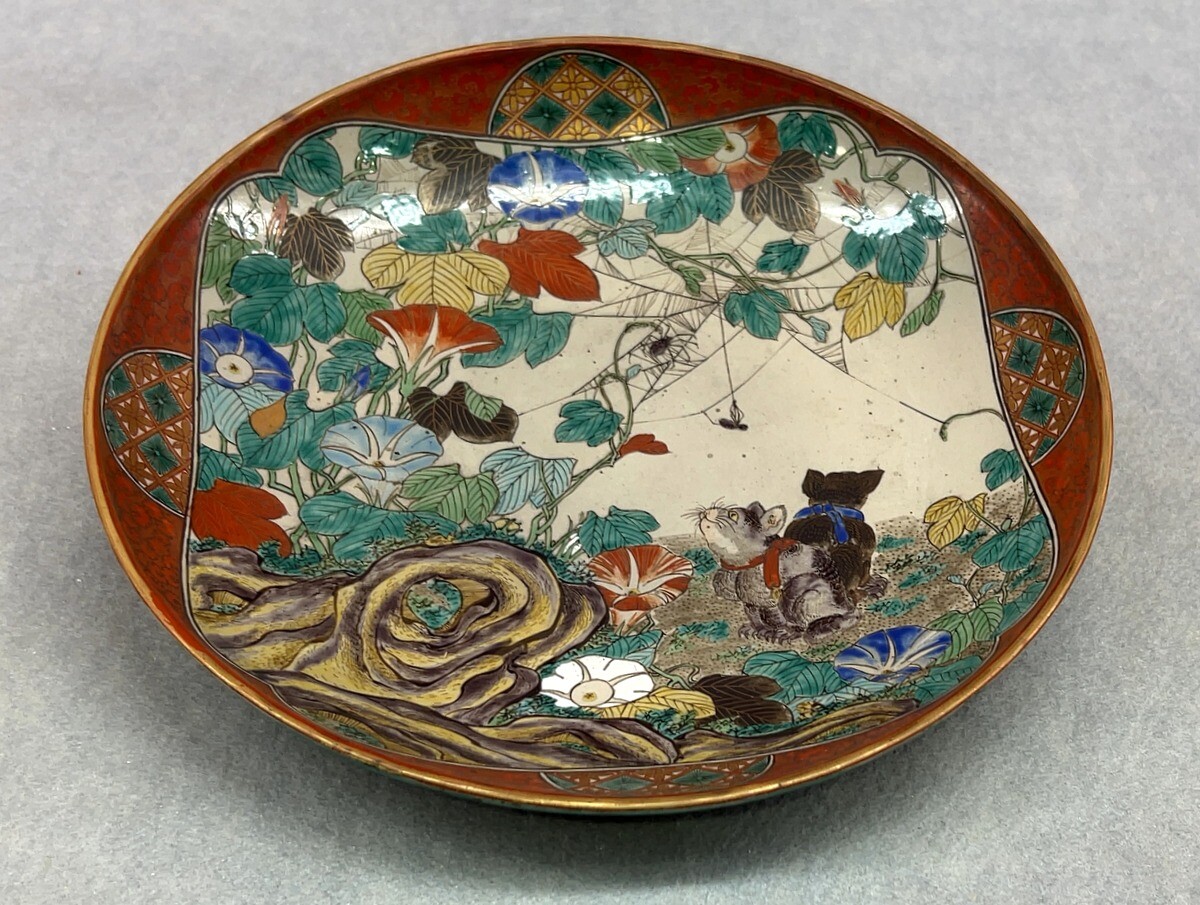 九谷庄三 1816~1883「色絵朝顔仔猫図平鉢」