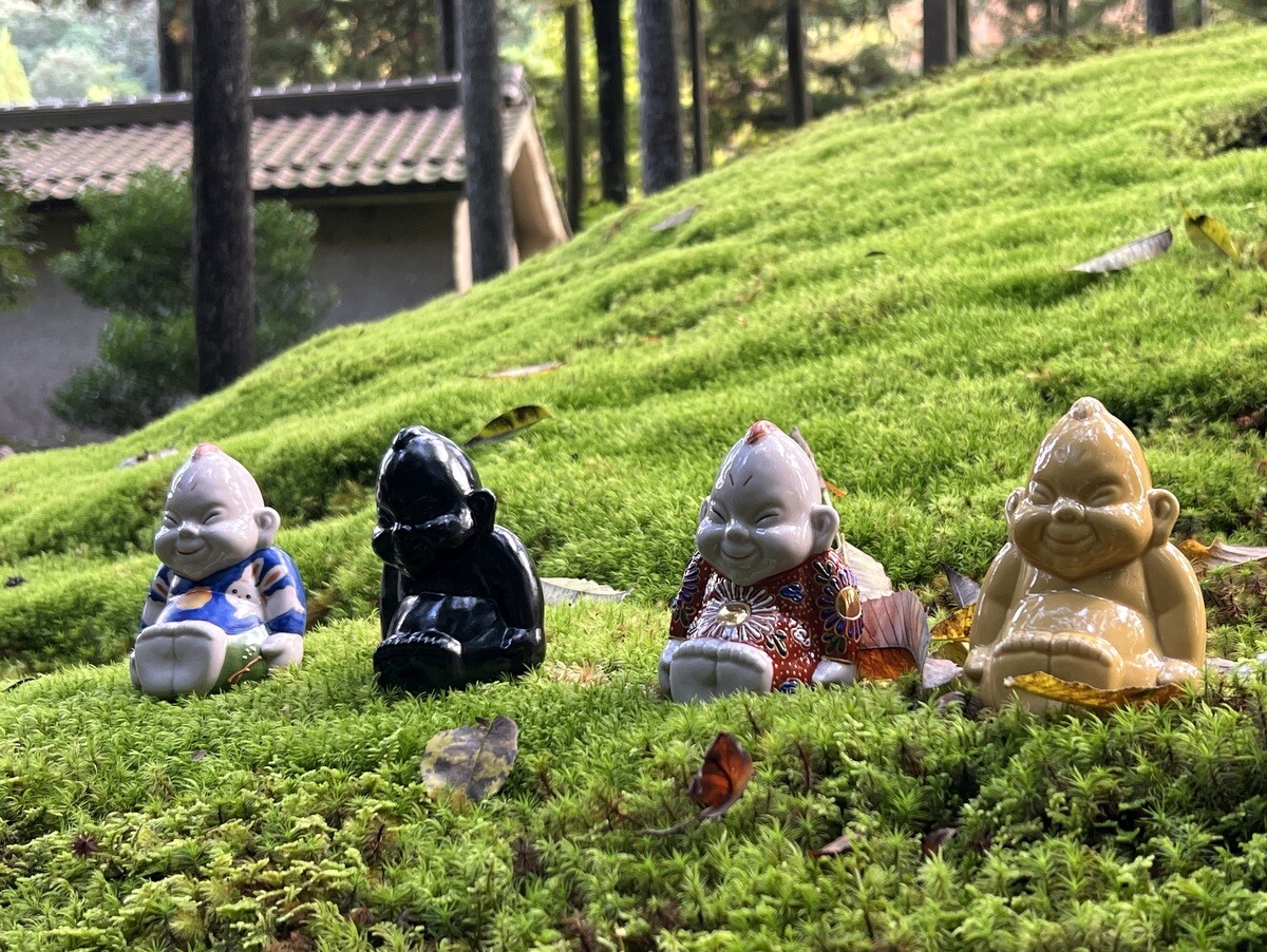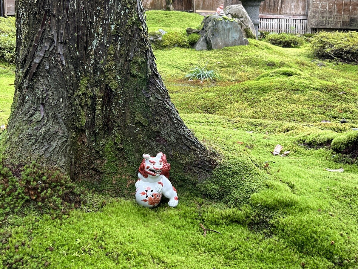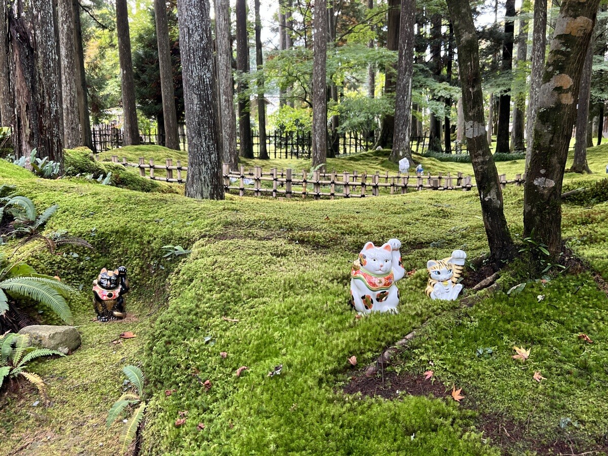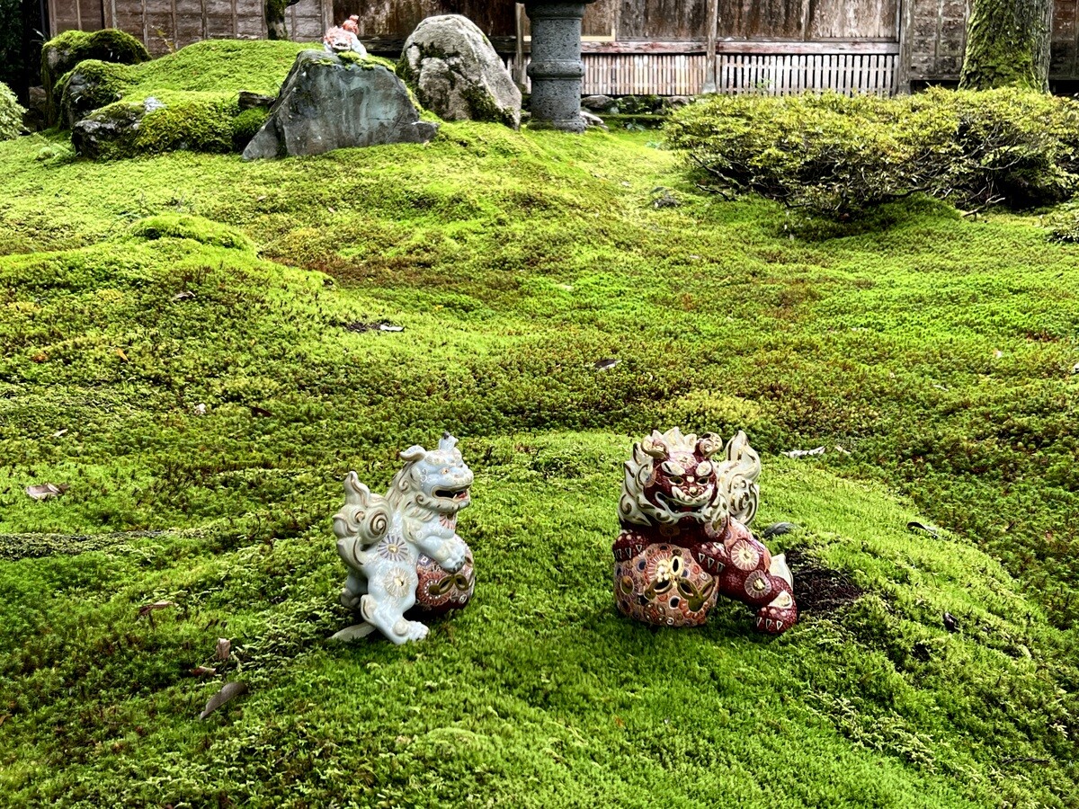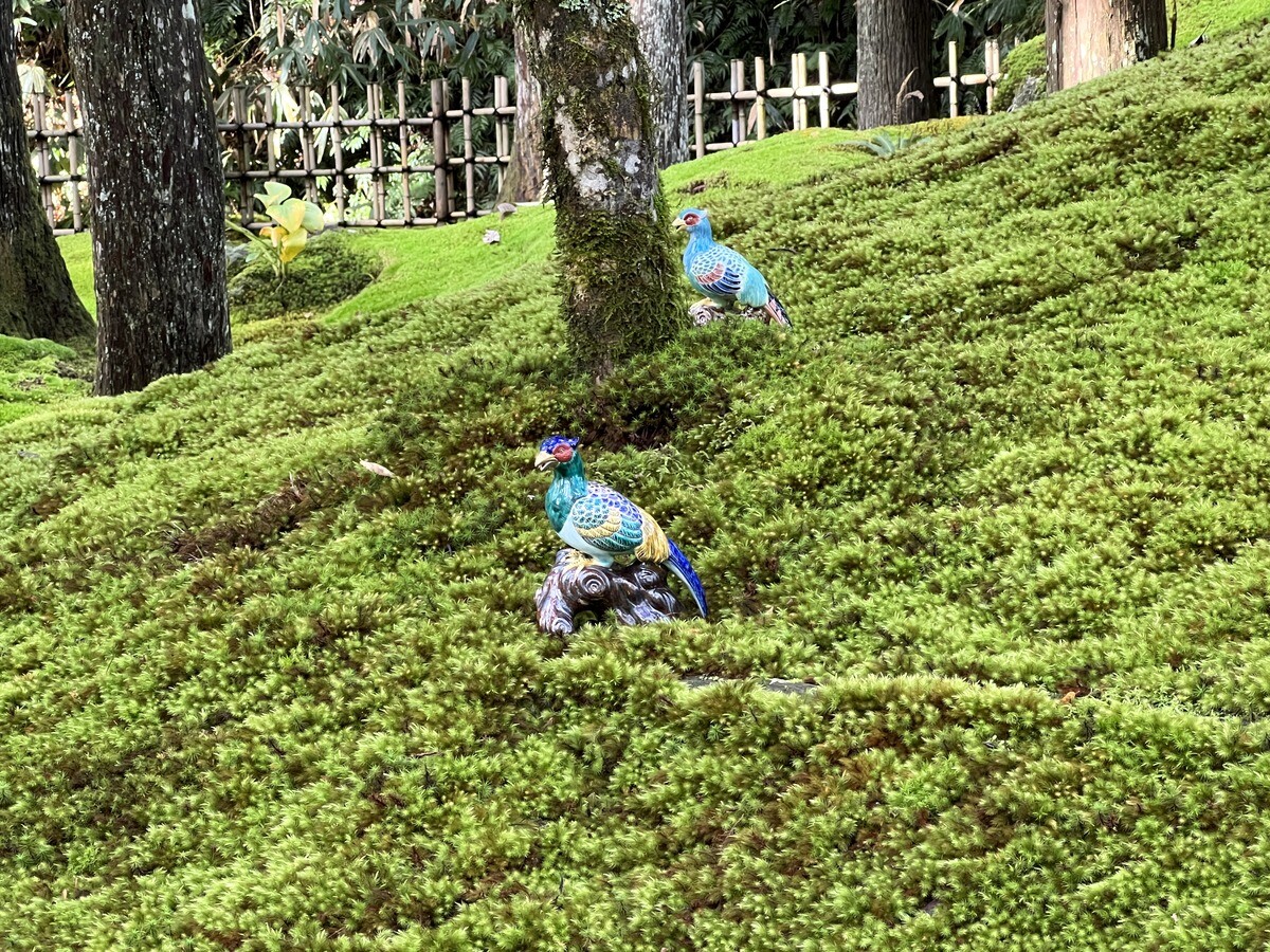 九谷焼の置物は、明治5年頃、松本新助が金沢藩士の奥野乾二郎を招いて置物を作らせたのが最初とされ、各地から彫刻家や人形師が招聘された。置物は、縁起ものとして、獅子、干支、招き猫などが作られ、絵付け職人だった初代米田五三郎が置物専門の商人に転身して全国に販路を拡大し広めて行ったとのこと。苔で有名な「苔の里」と置物のコラボが楽しめた。