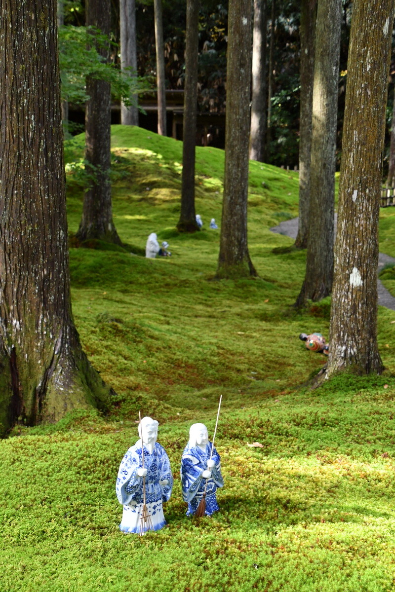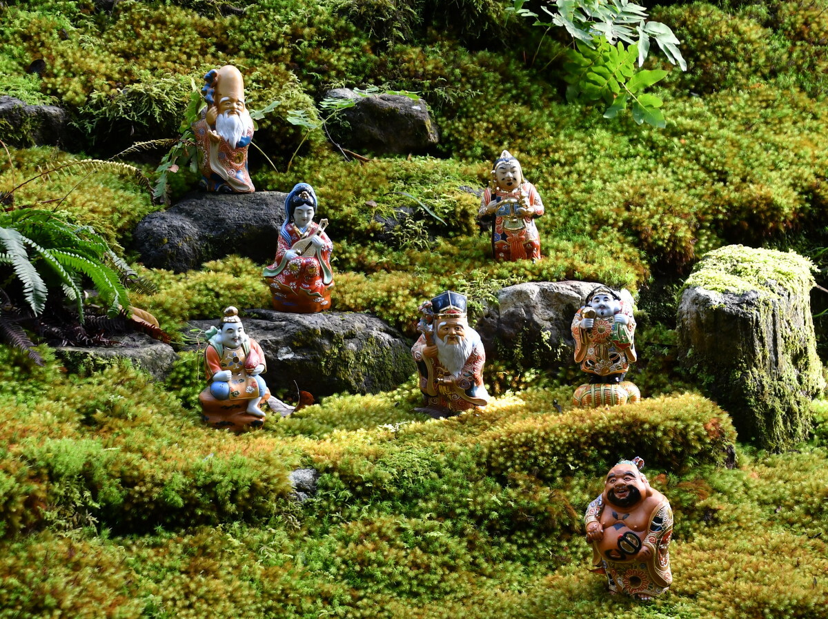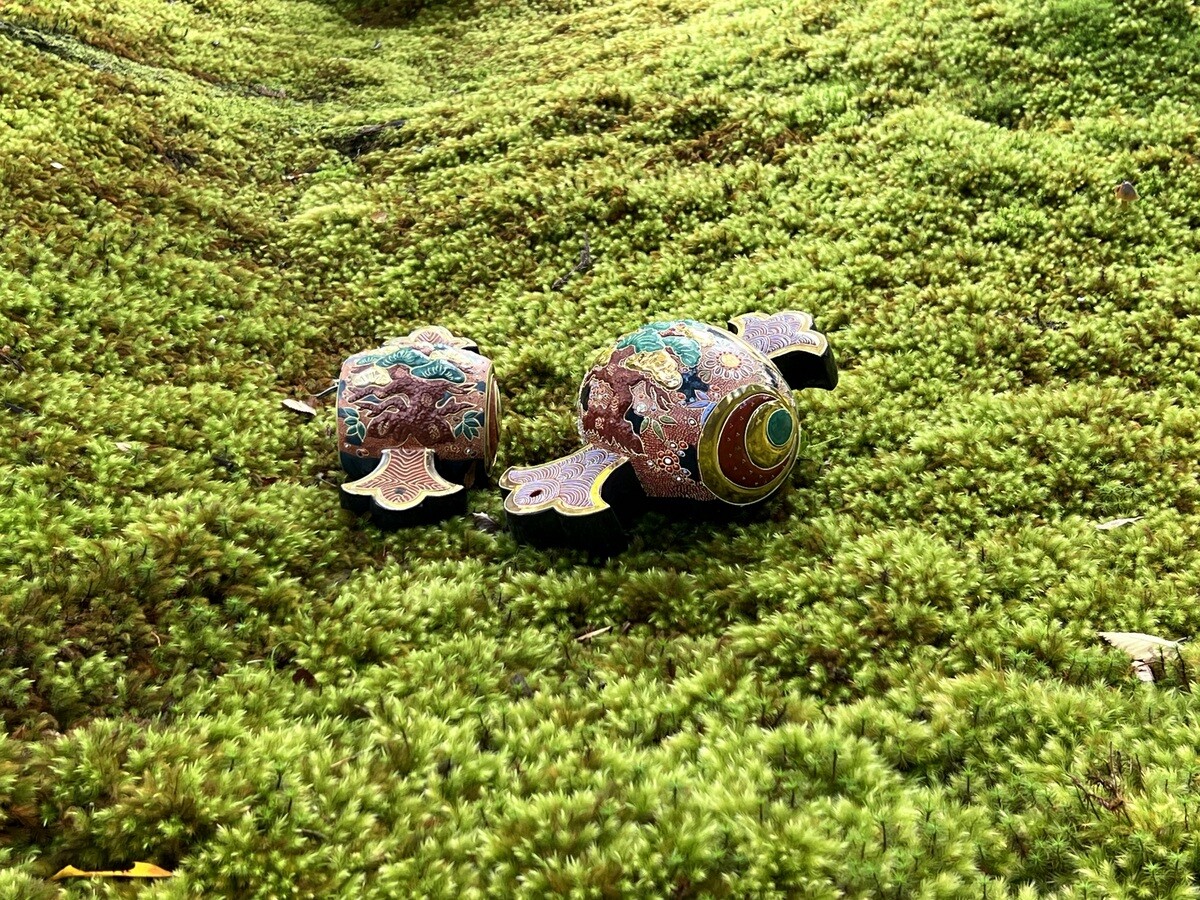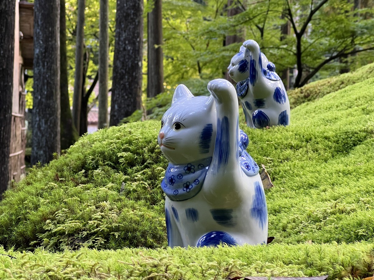 九谷焼の置物は、明治5年頃、松本新助が金沢藩士の奥野乾二郎を招いて置物を作らせたのが最初とされ、各地から彫刻家や人形師が招聘された。置物は、縁起ものとして、獅子、干支、招き猫などが作られ、絵付け職人だった初代米田五三郎が置物専門の商人に転身して全国に販路を拡大し広めて行ったとのこと。苔で有名な「苔の里」と置物のコラボが楽しめた。