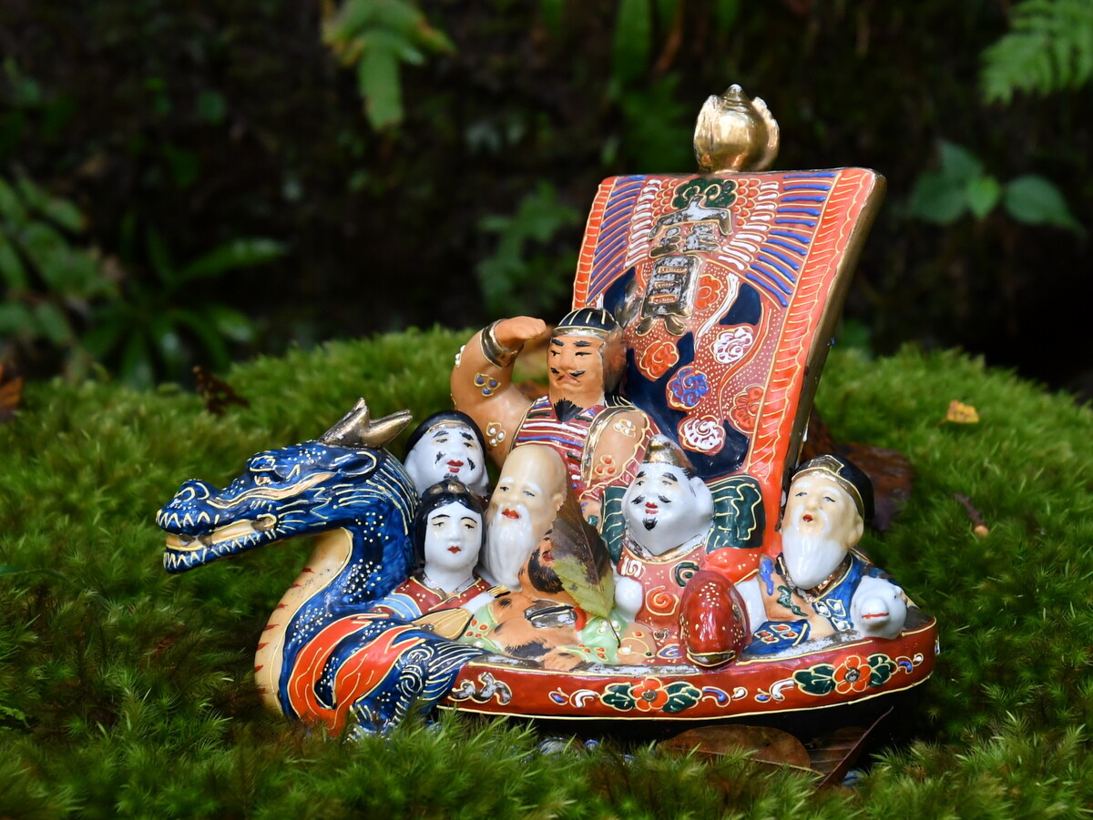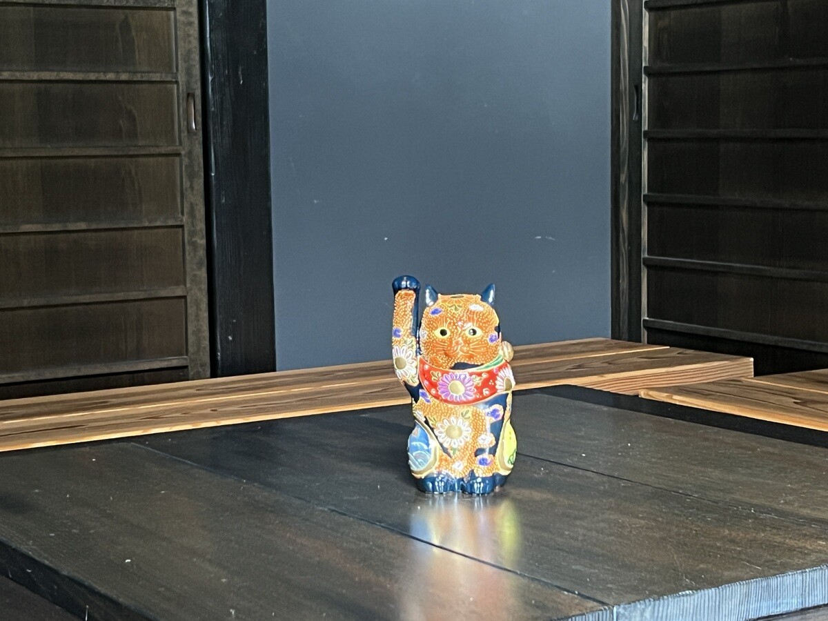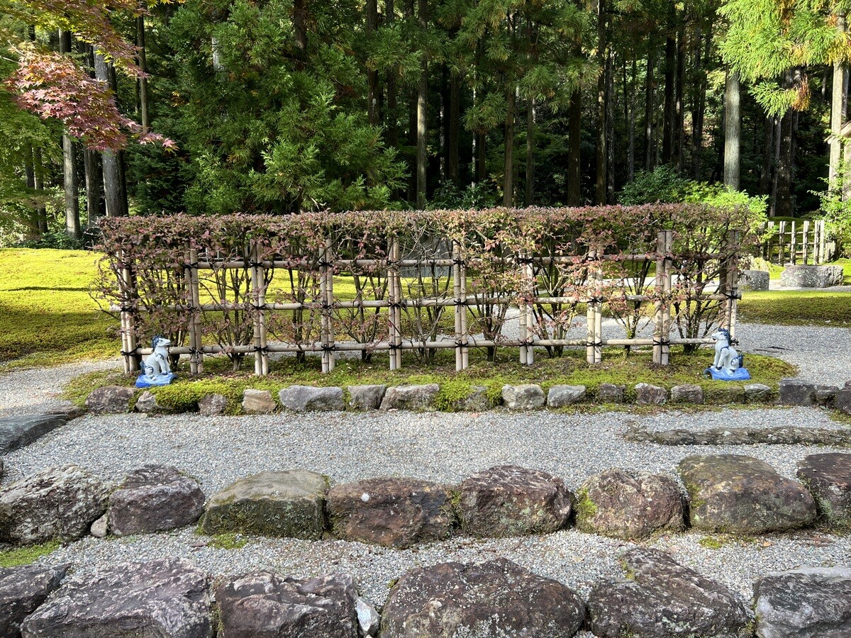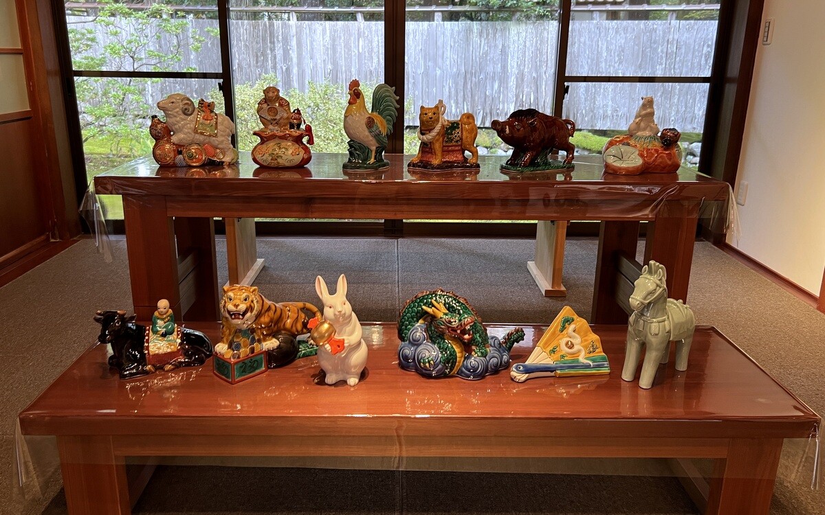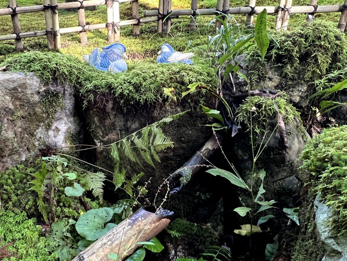 九谷焼の置物は、明治5年頃、松本新助が金沢藩士の奥野乾二郎を招いて置物を作らせたのが最初とされ、各地から彫刻家や人形師が招聘された。置物は、縁起ものとして、獅子、干支、招き猫などが作られ、絵付け職人だった初代米田五三郎が置物専門の商人に転身して全国に販路を拡大し広めて行ったとのこと。苔で有名な「苔の里」と置物のコラボが楽しめた。