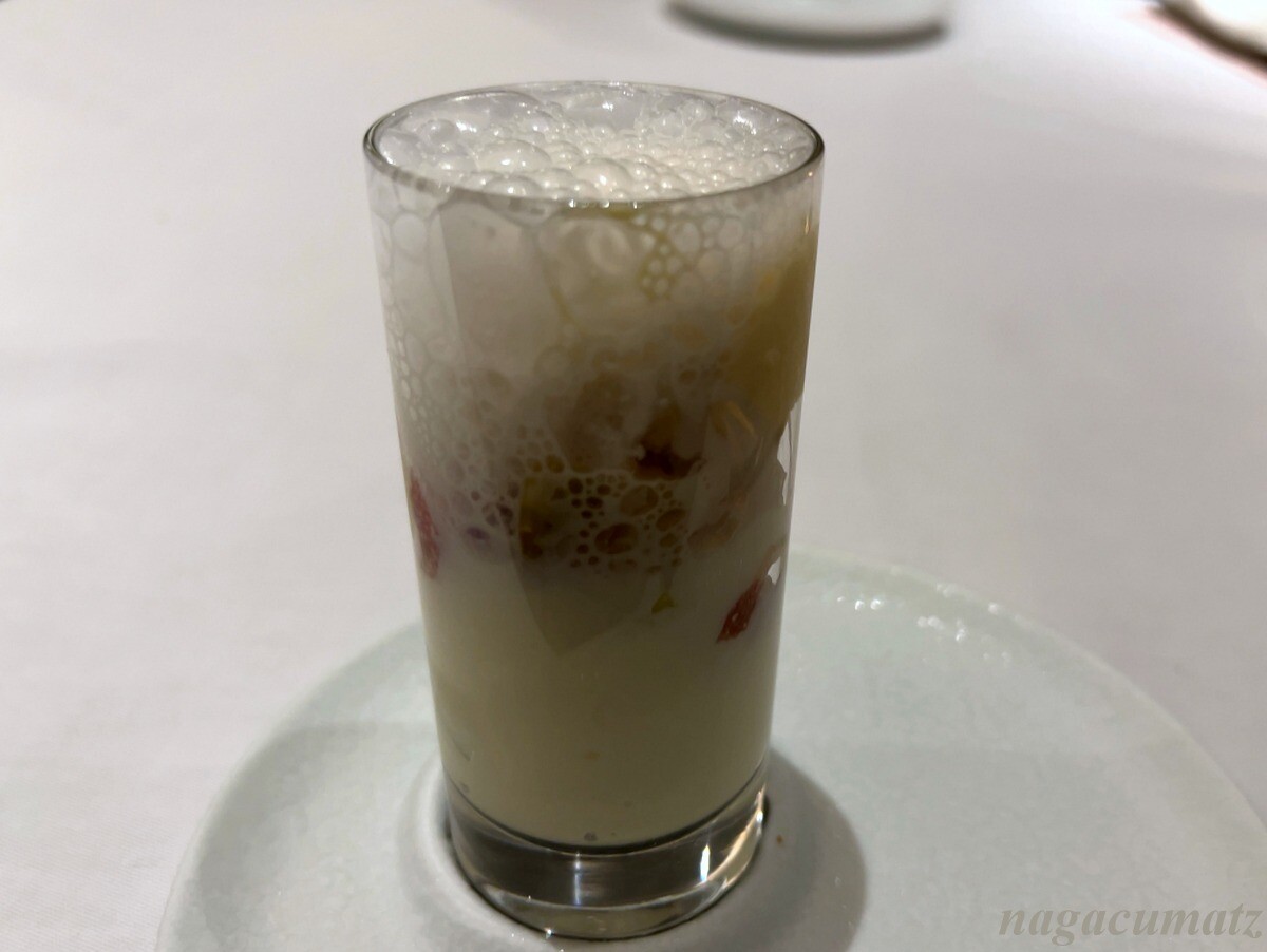 何層にもなった北海道の野付の帆立の下には、根セロリ。上に載ったシャインマスカットの甘味やハーブ各種の香りなどと相まって、美味しい。