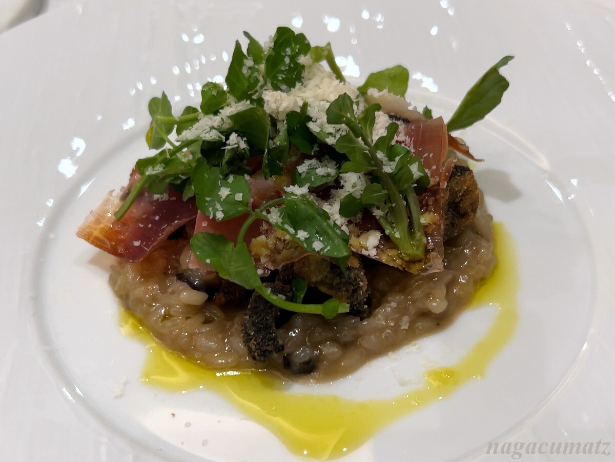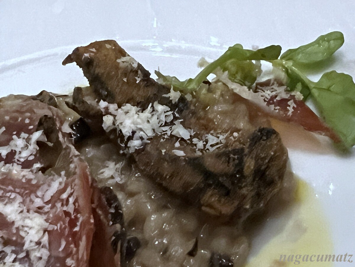 香茸のリゾットに、その生ハムが使われている。香茸は、人工栽培ができないため希少性が高く、松茸以上の高値で取引きされている高級茸とのことで、香りが高いからそのネーミングにもなったとか。しかし、たくさん使っておられるがあまり風味は感じられず、リゾットも塩分を抑えておられるせいか、生ハムの塩味だけで食べる印象。