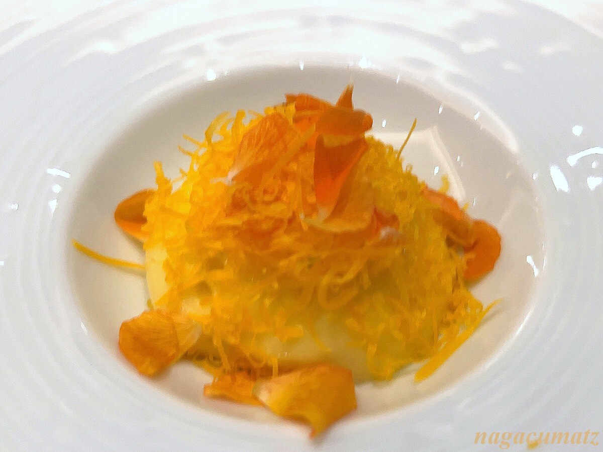 ミモレットをキャロットラペ風にしたアミューズには、オレンジの泡が付いている。