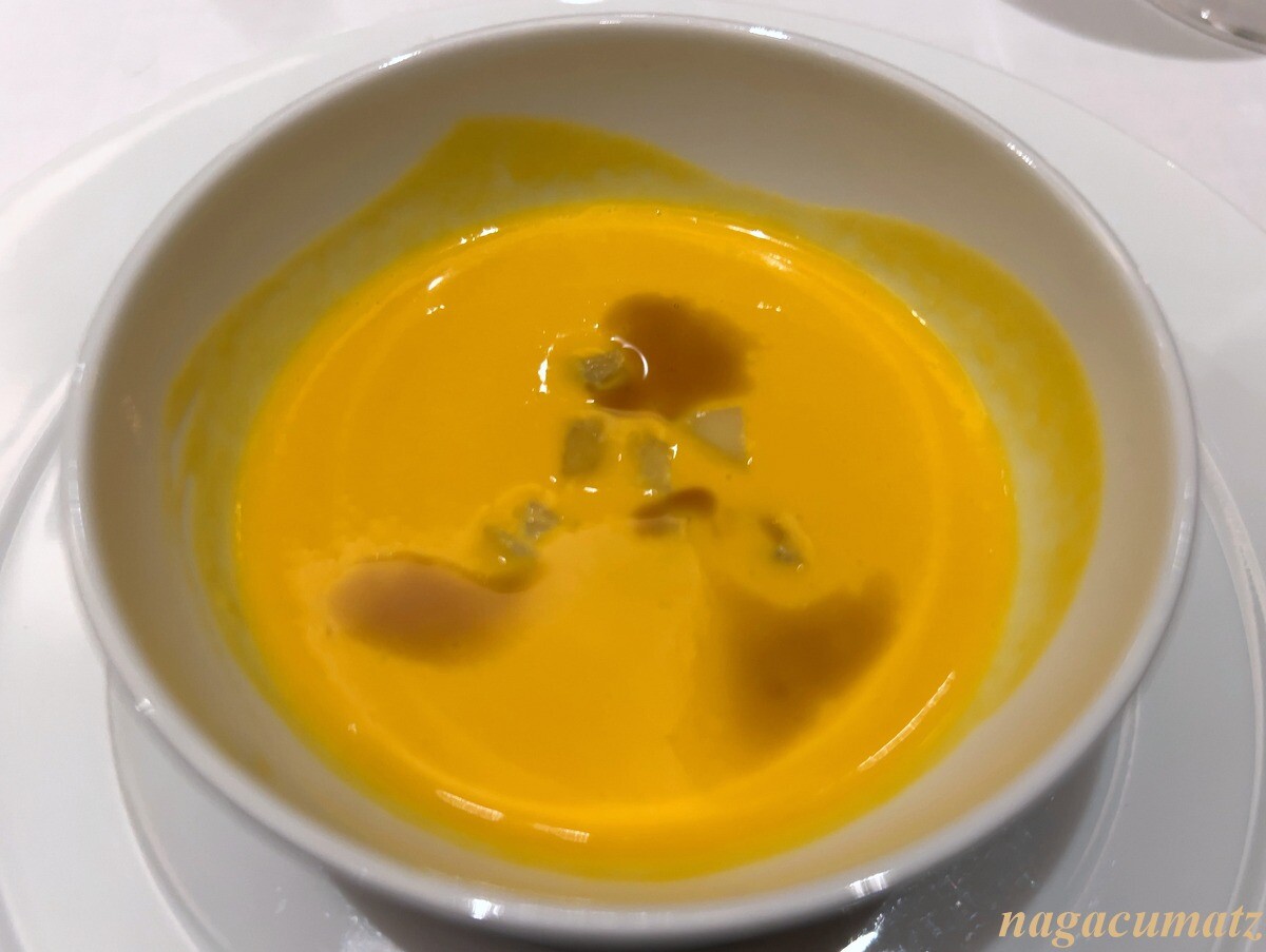 アミューズ二品目は、バターナッツスクワッシュの冷製ポタージュ。栗と南瓜の種から採ったオイルが、なかなかナッティで良い香り。