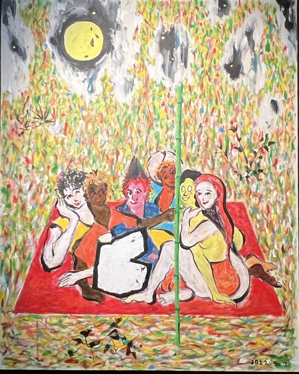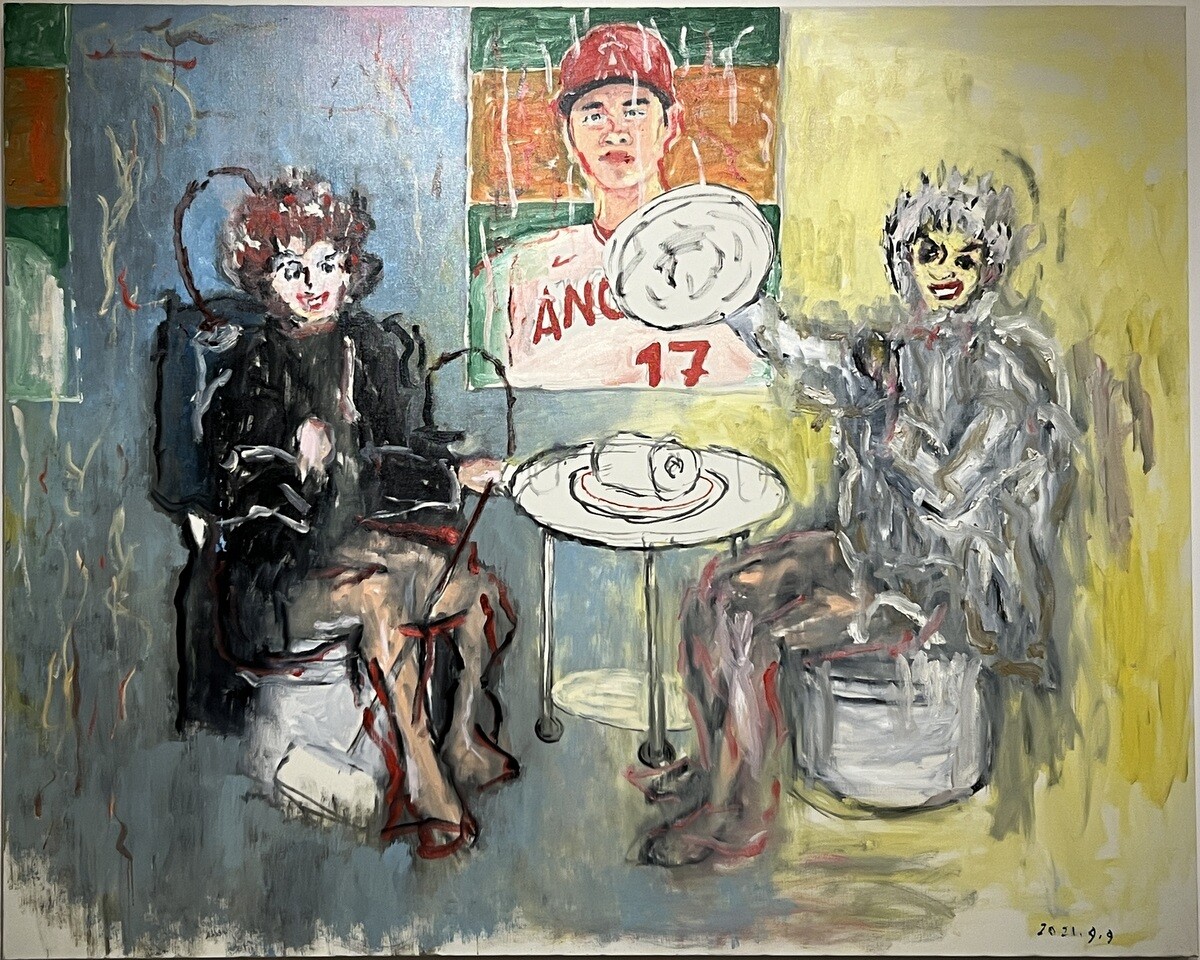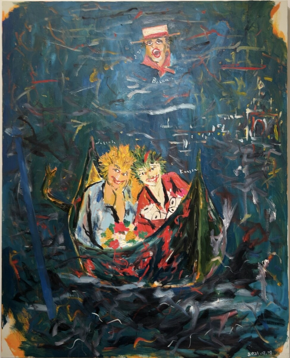結婚式をしている人達と寒山拾得が描かれている。拾得は箒を持ち、その隣の男性とも髪がボサボサなので、拾得の横が寒山であろうと。右下にサーキュレーターがあり、コロナ禍の真っ最中であることも示している。何かのTV番組で、この絵を描いておられる様子が放映されていたが、最後の最後にサーキュレーターを描き足しておられた。