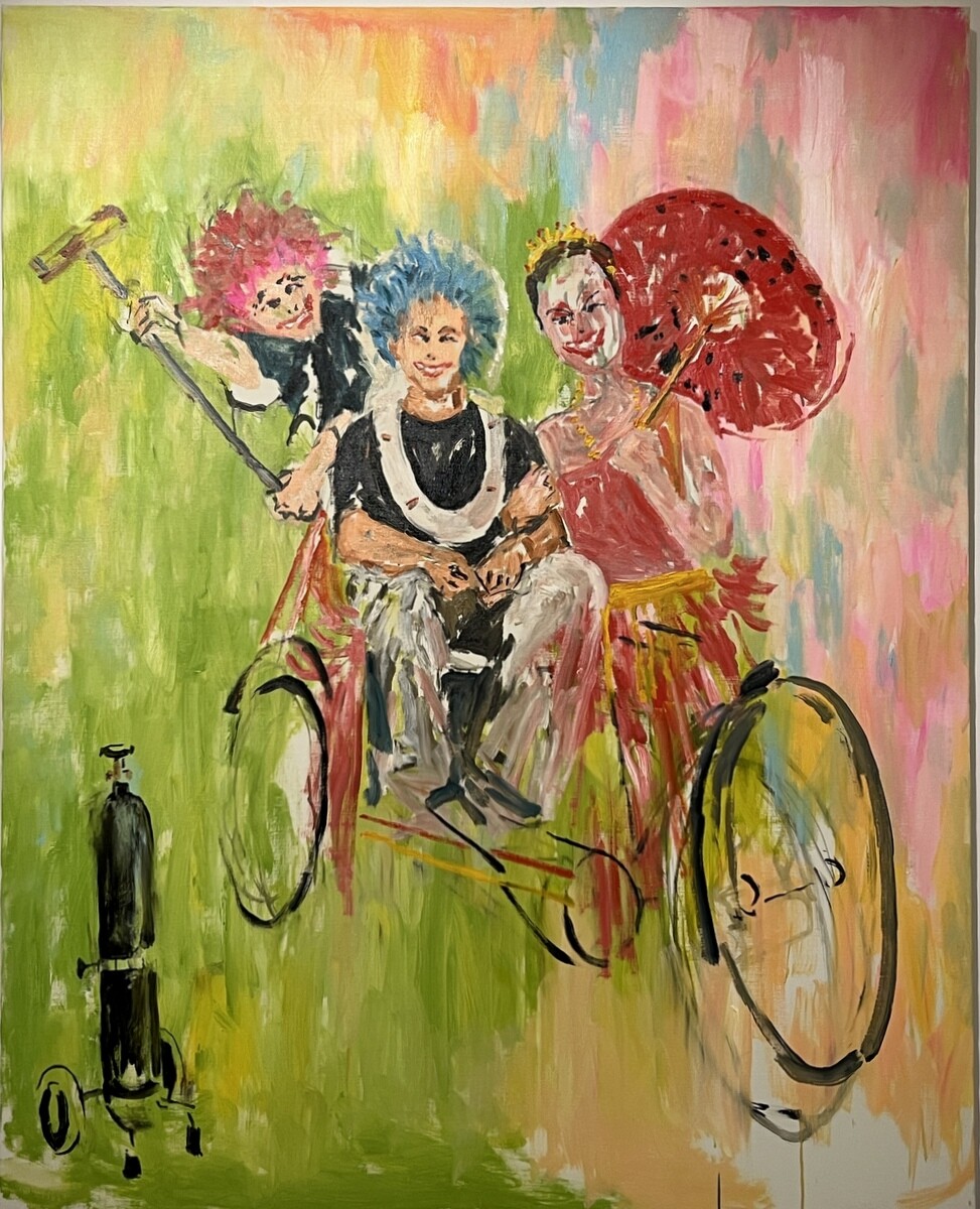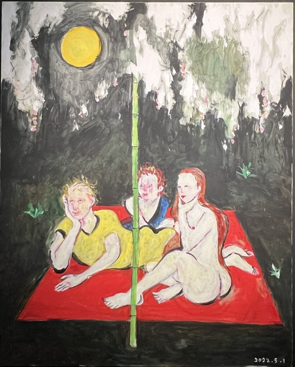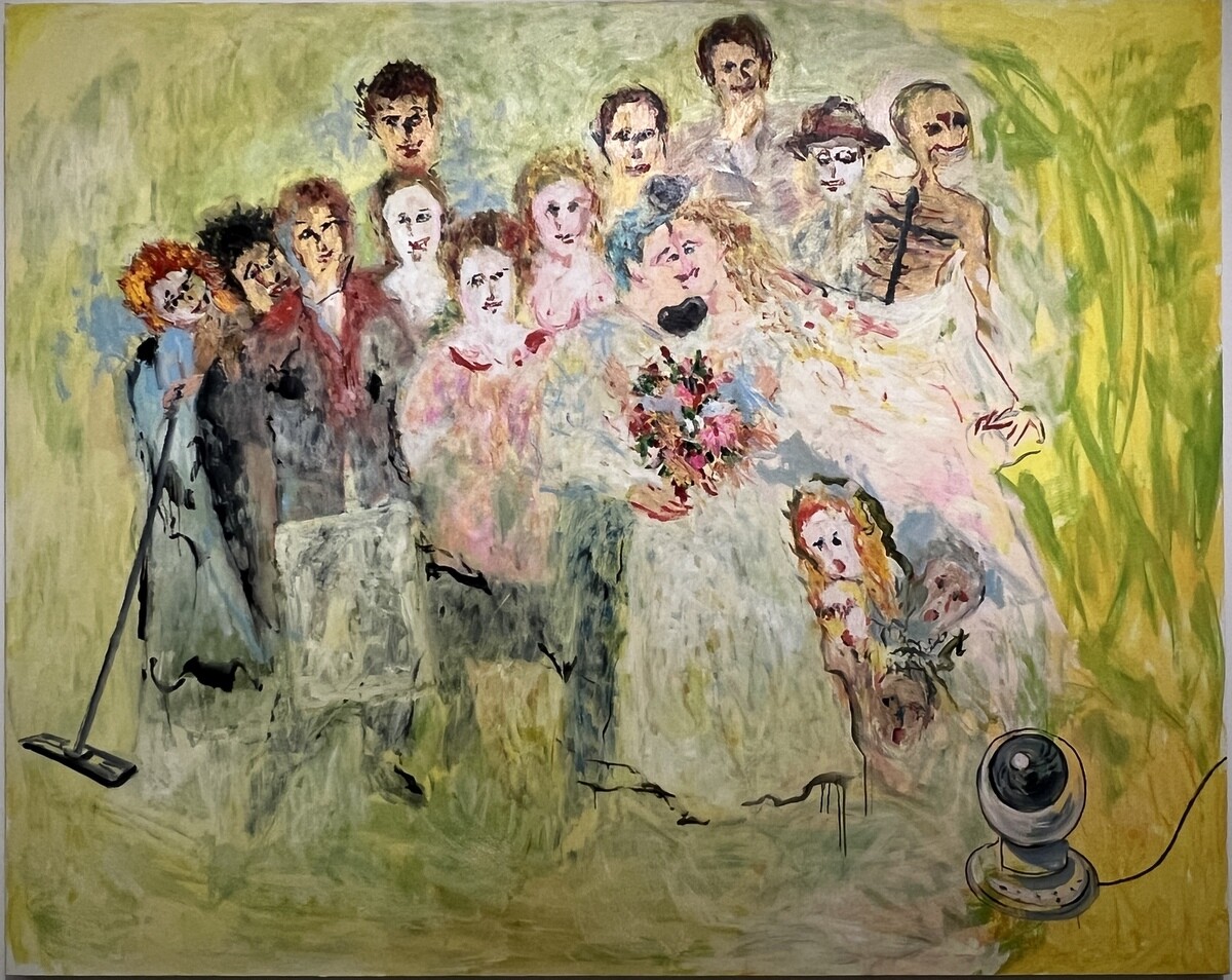 結婚式をしている人達と寒山拾得が描かれている。拾得は箒を持ち、その隣の男性とも髪がボサボサなので、拾得の横が寒山であろうと。右下にサーキュレーターがあり、コロナ禍の真っ最中であることも示している。何かのTV番組で、この絵を描いておられる様子が放映されていたが、最後の最後にサーキュレーターを描き足しておられた。