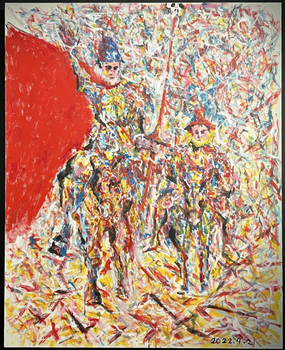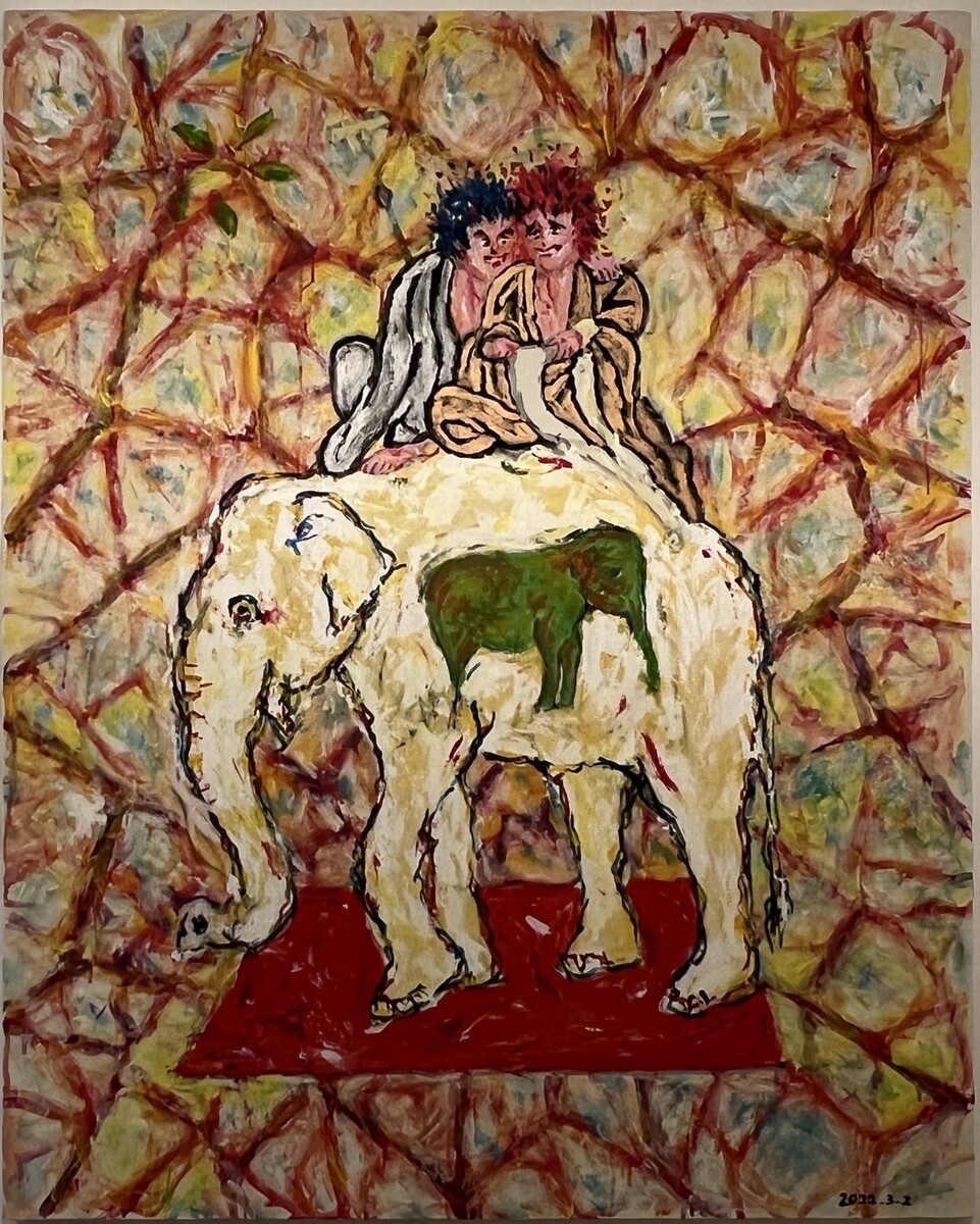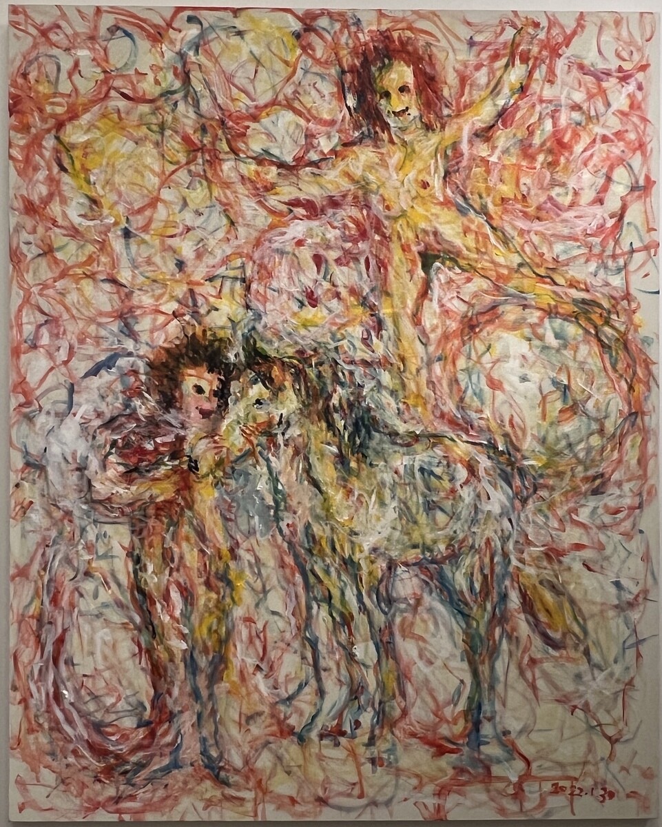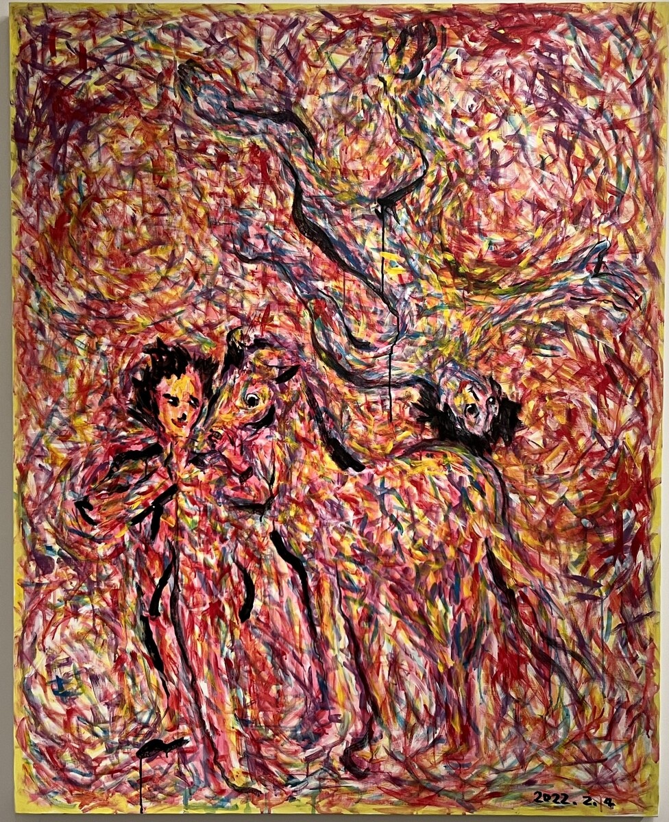 2022.01.30 17点目の作品。馬とたわむれる寒山と拾得。輪郭は曖昧で、ぼやけた印象だが、「朦朧体」という横尾氏が近年新しくあみだした画法。年々からだが不自由になる中で生まれたとのこと。