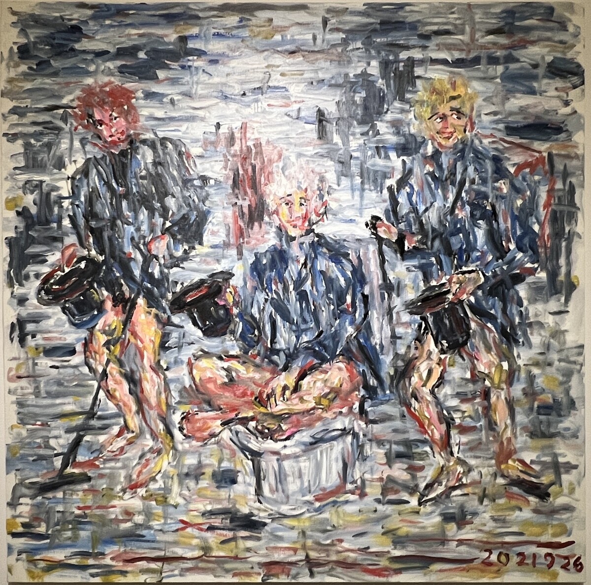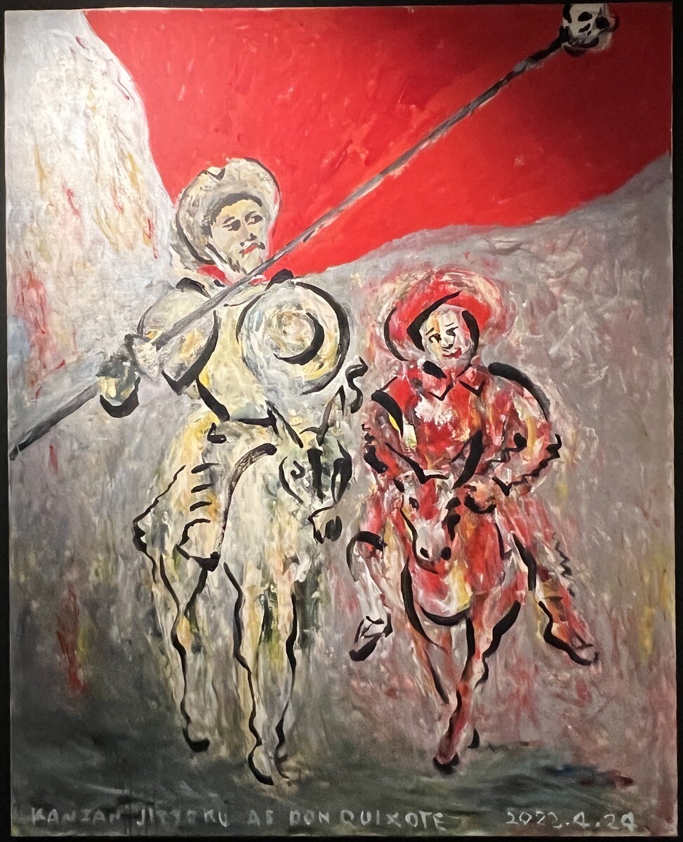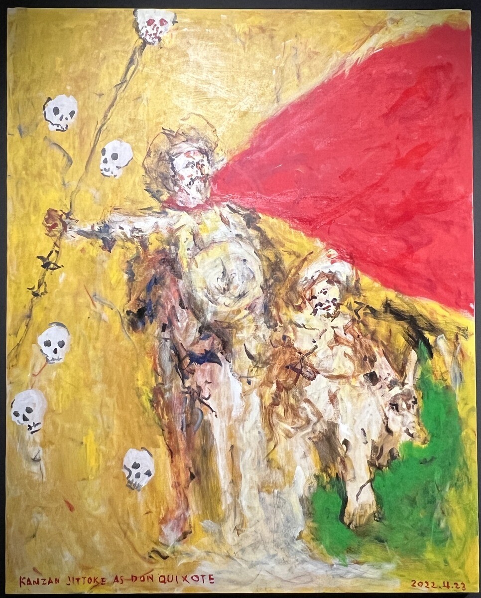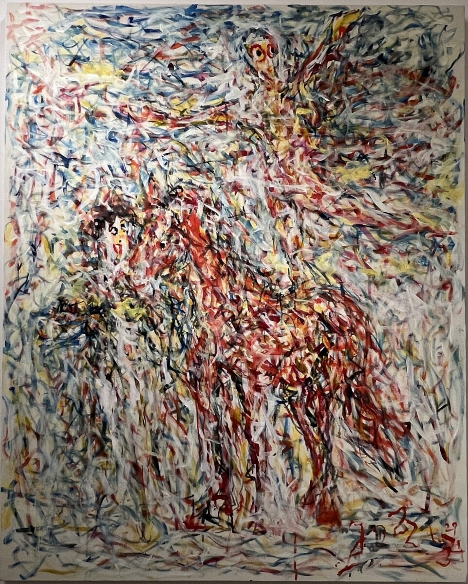 2022.01.30 17点目の作品。馬とたわむれる寒山と拾得。輪郭は曖昧で、ぼやけた印象だが、「朦朧体」という横尾氏が近年新しくあみだした画法。年々からだが不自由になる中で生まれたとのこと。