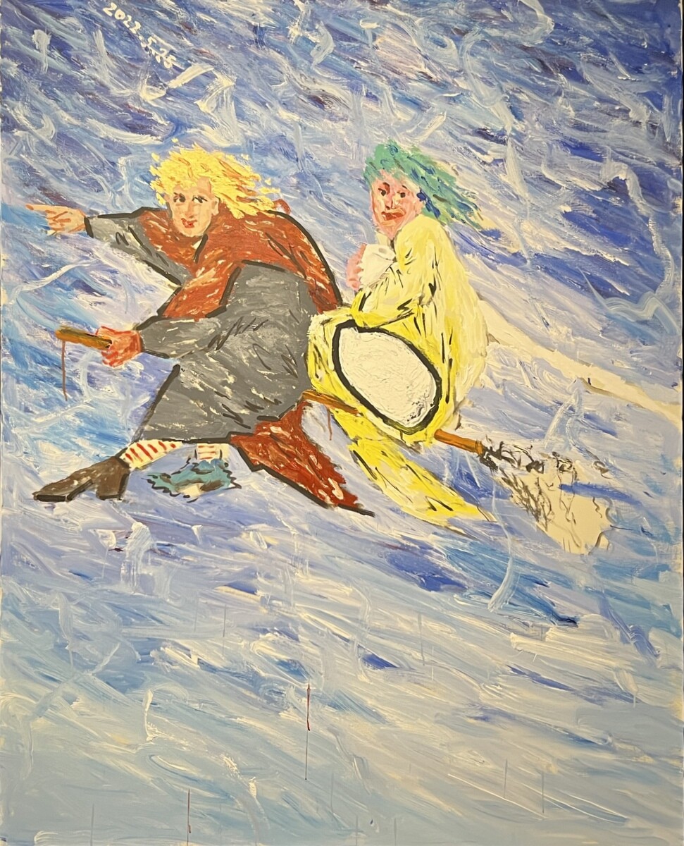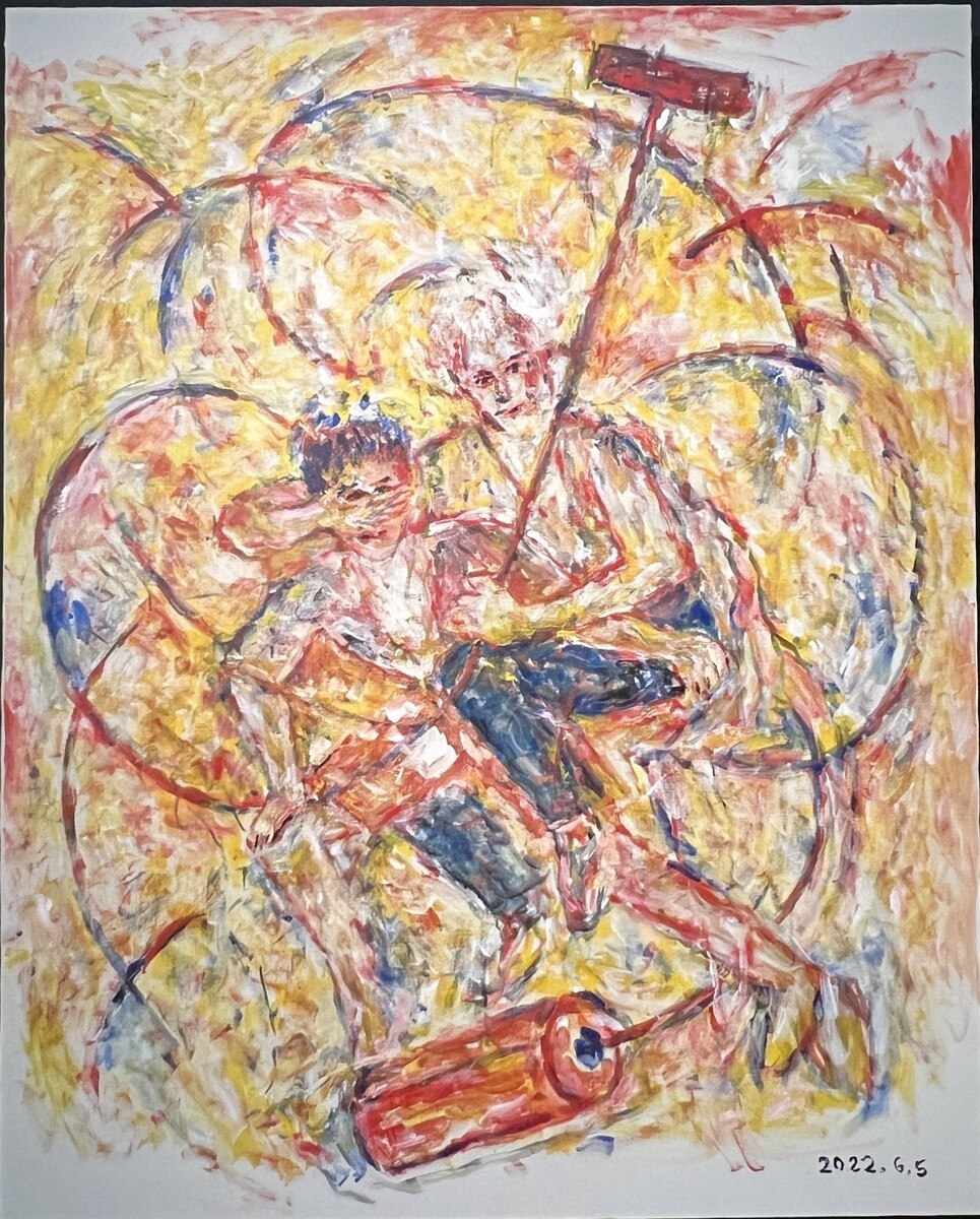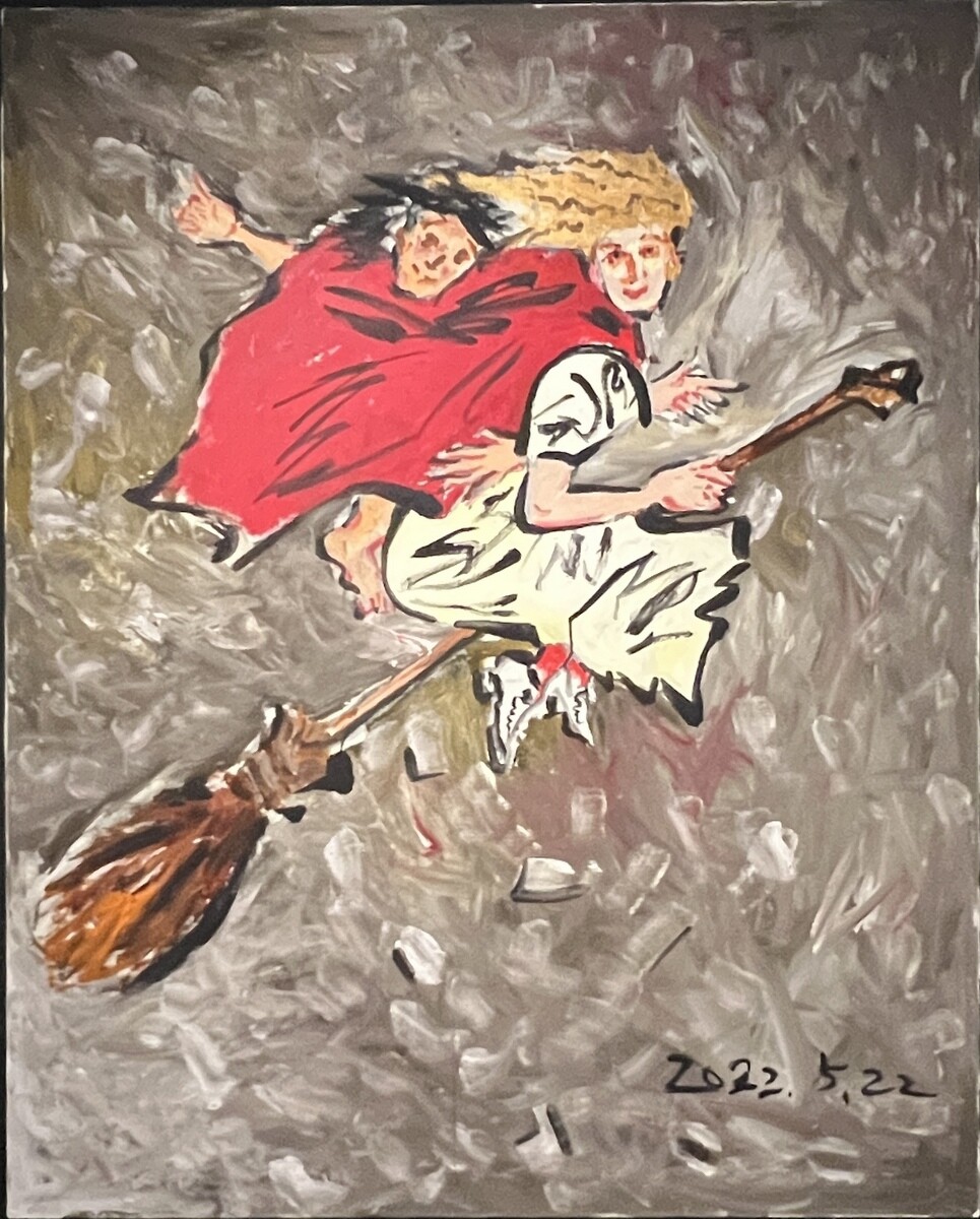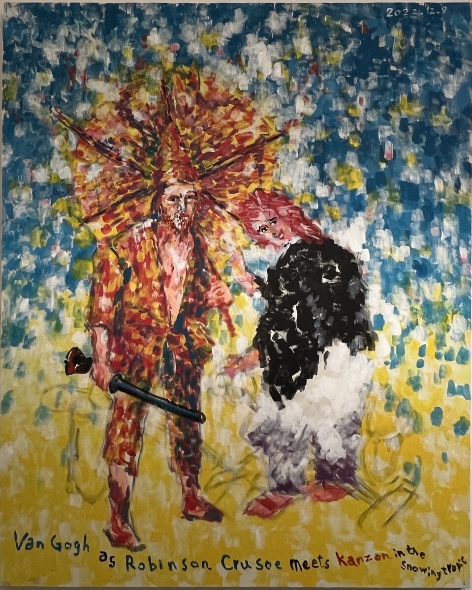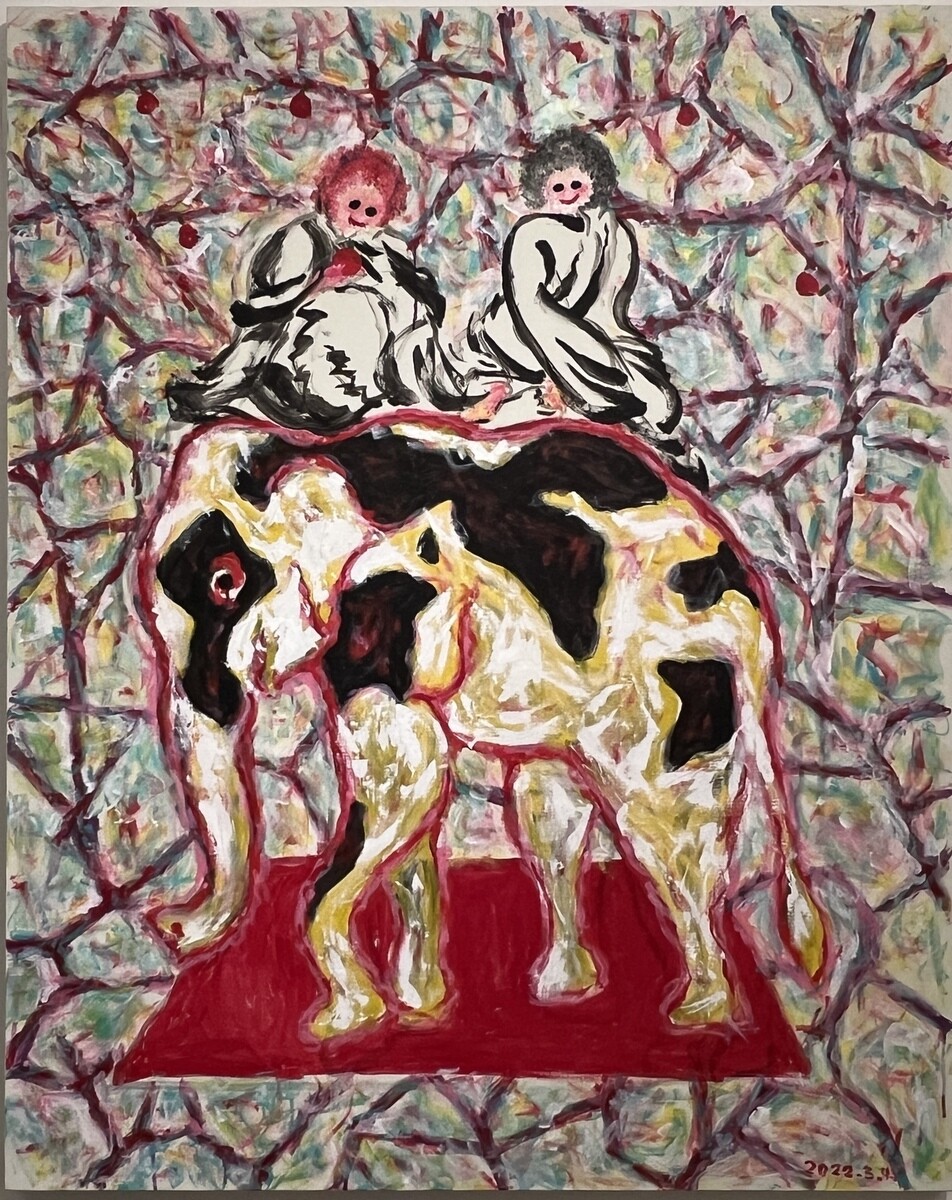2022.01.30 17点目の作品。馬とたわむれる寒山と拾得。輪郭は曖昧で、ぼやけた印象だが、「朦朧体」という横尾氏が近年新しくあみだした画法。年々からだが不自由になる中で生まれたとのこと。