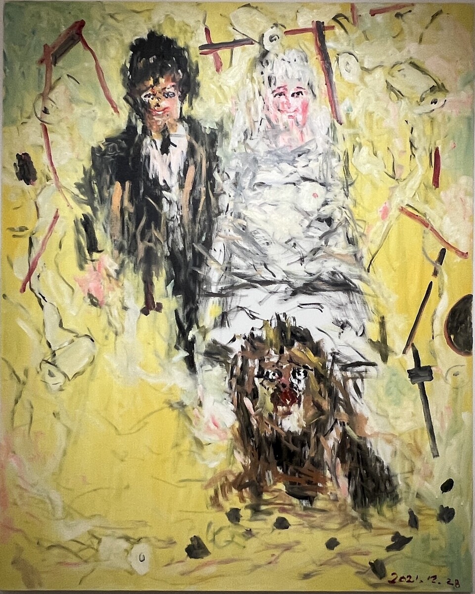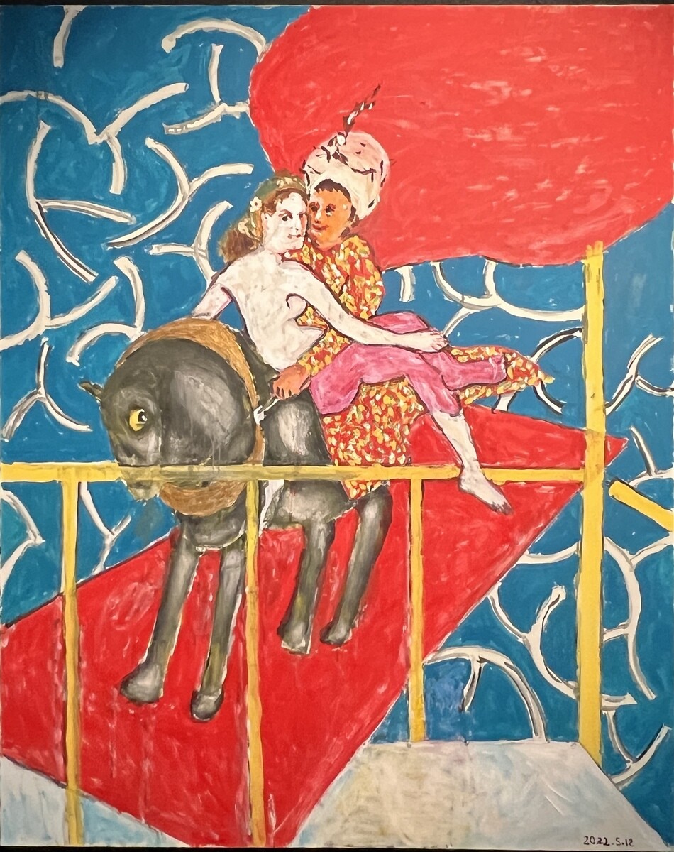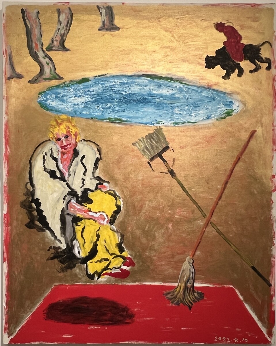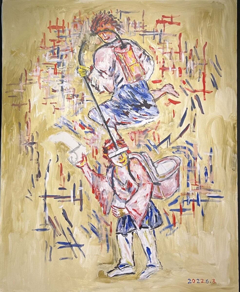 2022.01.30 17点目の作品。馬とたわむれる寒山と拾得。輪郭は曖昧で、ぼやけた印象だが、「朦朧体」という横尾氏が近年新しくあみだした画法。年々からだが不自由になる中で生まれたとのこと。