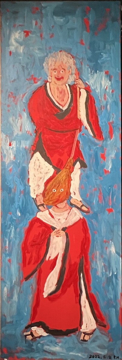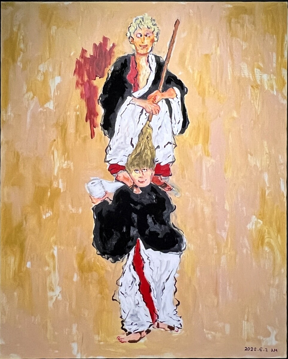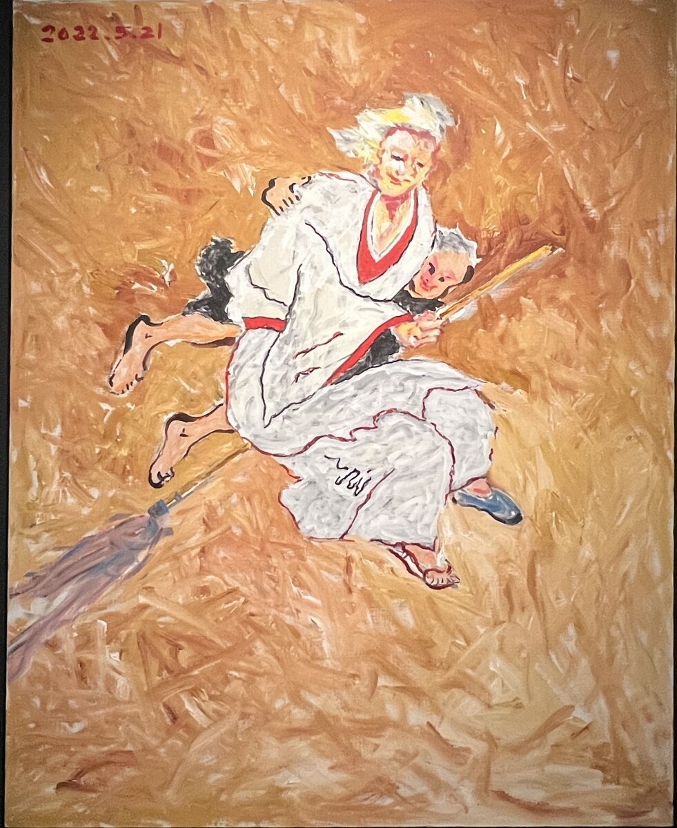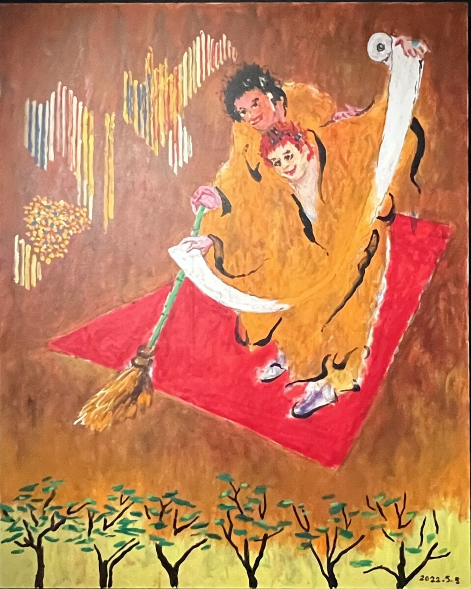 2022.06.02 AM 47点目。拾得が寒山の肩の上に載っており、箒が拾得の髪と一体化している。もともと寒山と言うひとりの人物で、拾得は分身と言う、歴史的な解釈もあるのだそう。