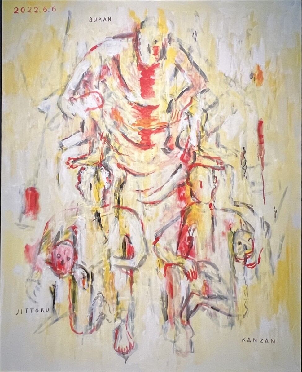 「寒山拾得」を102枚の作品に再構築したもので、100号ぐらいの大きさで描けば、会場にちょうど100点ほど並ぶだろうと、「寒山拾得」の「拾」を「百」に変えてみようと思われたのだそう。