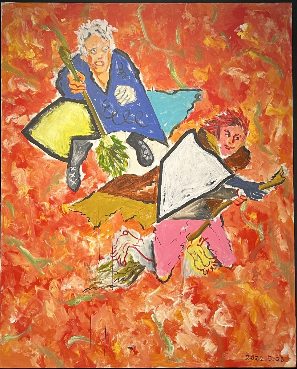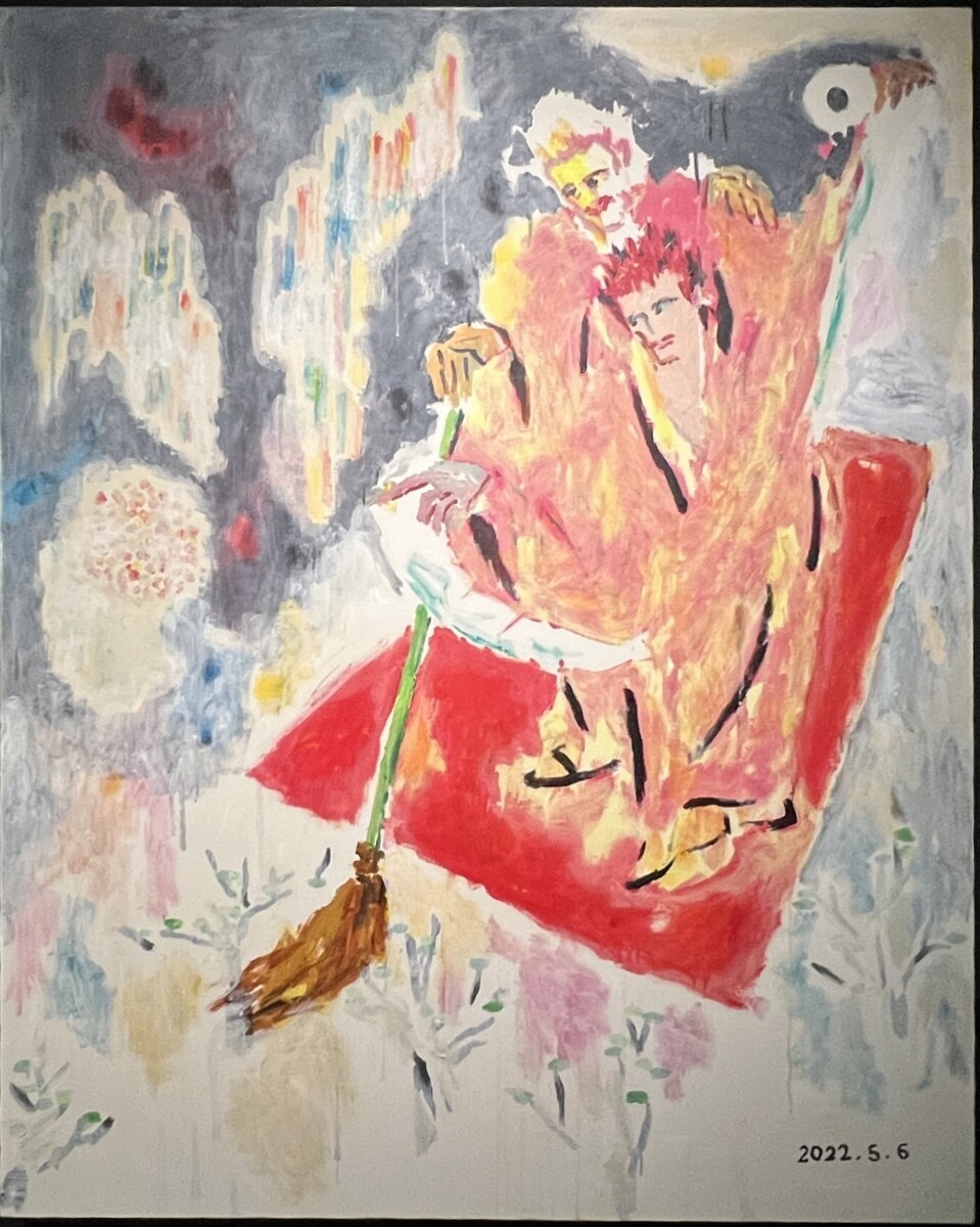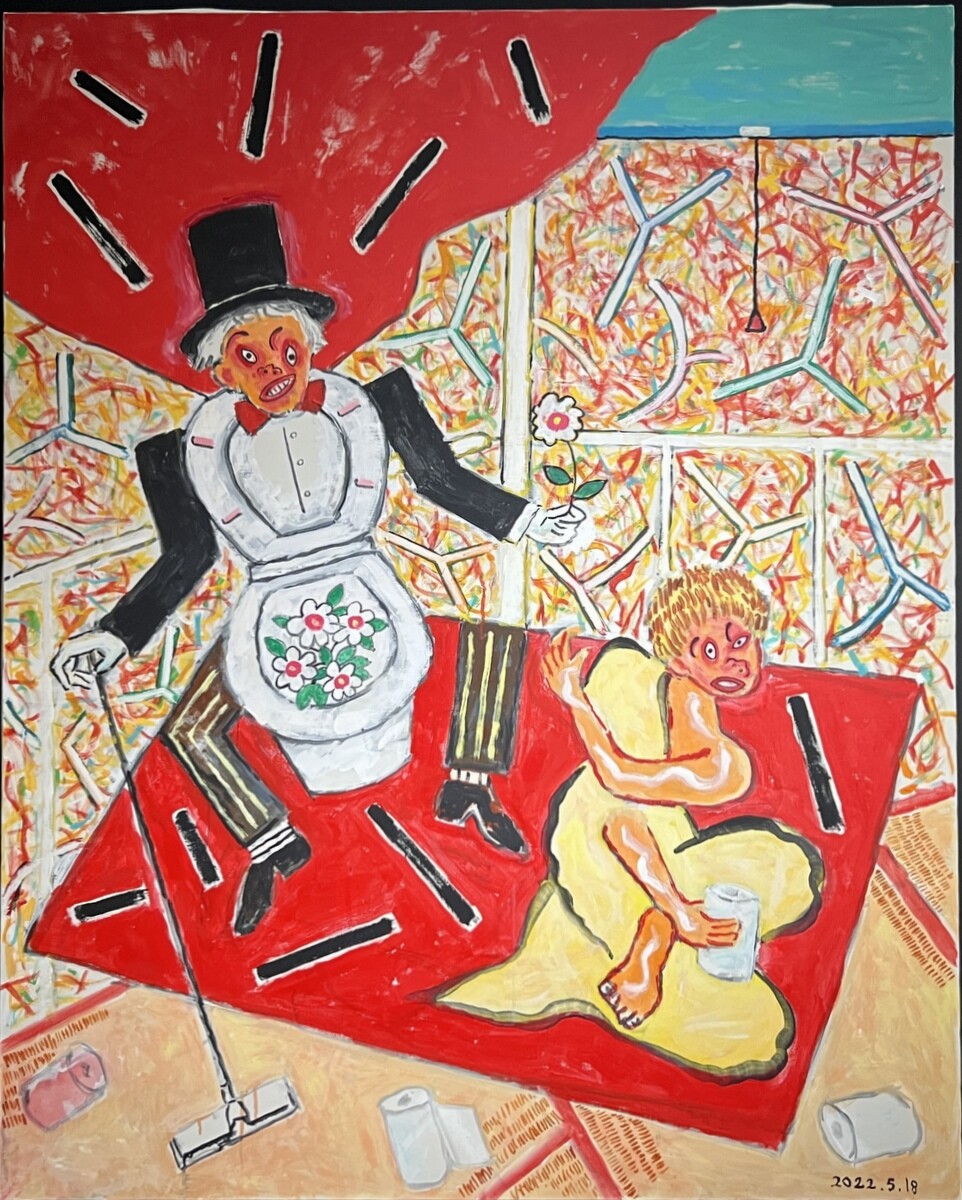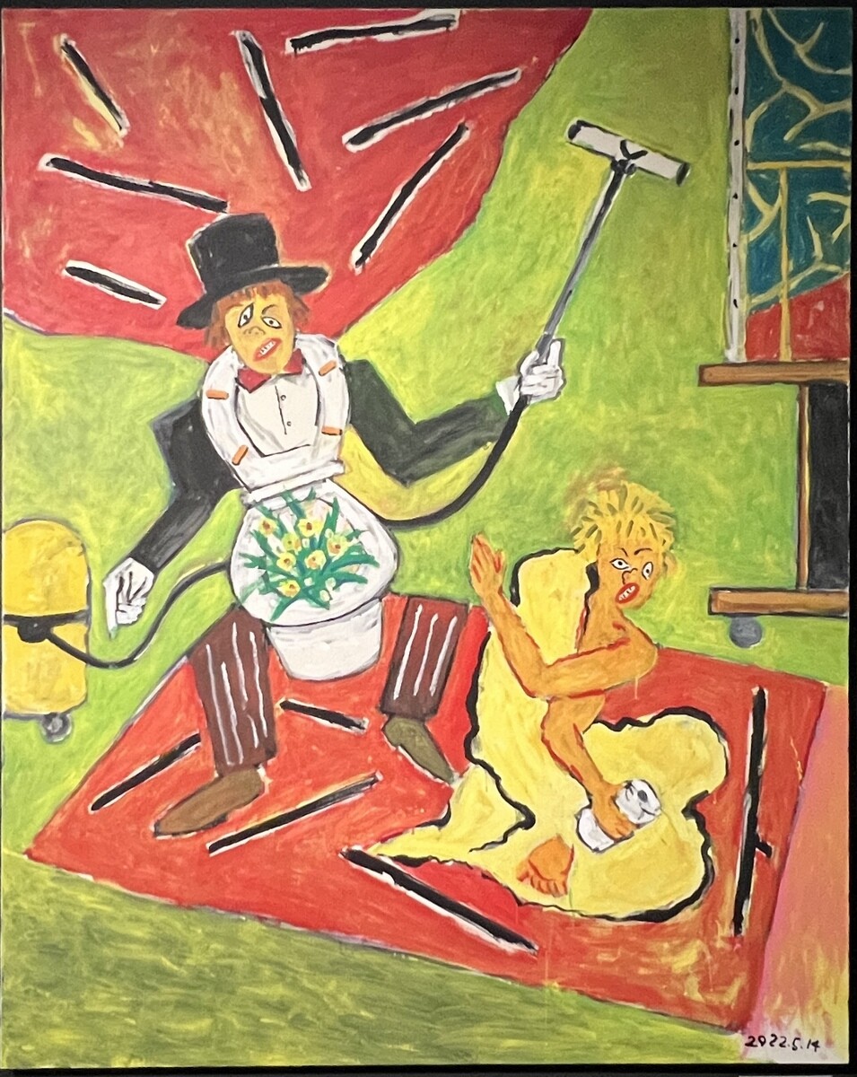 2021.09.21-2 シリーズ7点目の作品は、便器の上に座る寒山の上には巻物の代わりにトイレットペーパーが描かれ、拾得は電気の掃除機。