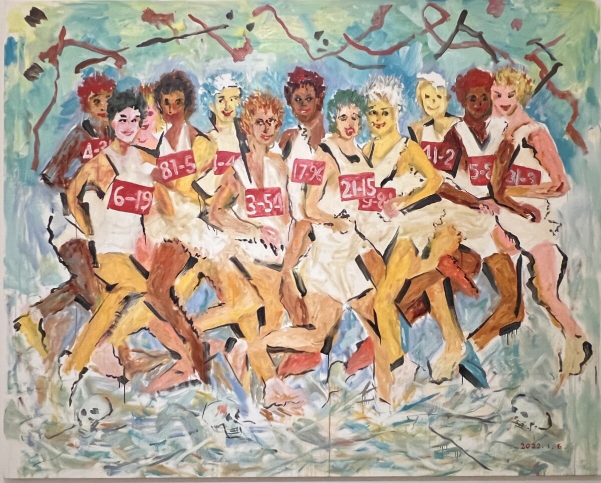 2022.01.06 13点目。大勢のアスリートが走り出す様子。誰も掃除機やトイレットペーパーは持っておらず、寒山や拾得が誰だかわからないが、足元には髑髏がある。
