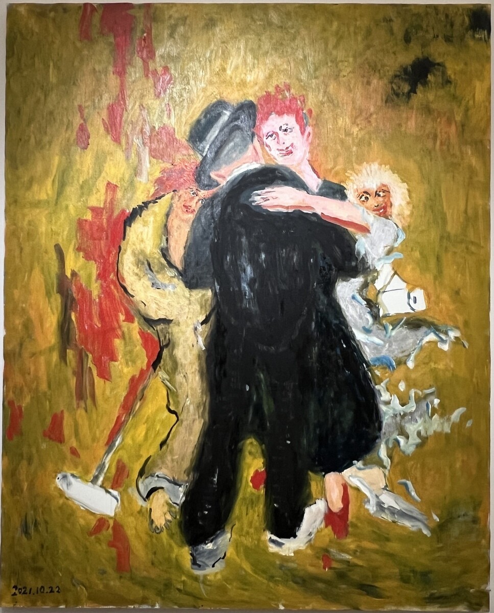 2021.10.22 10点目。シルクハットと女性が踊っている脇に寒山と拾得がいる。掃除機とトイレットペーパーが登場。