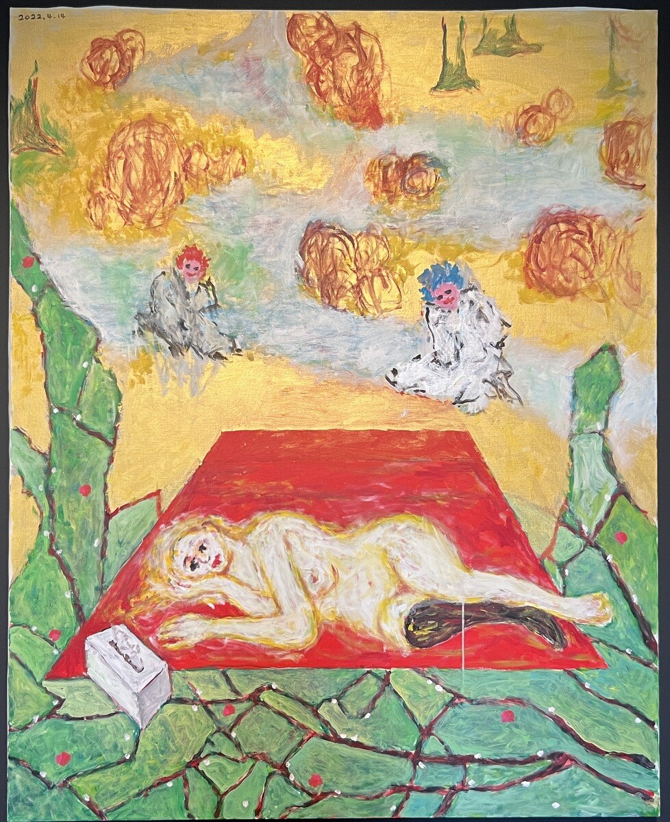 近年、横尾氏は難聴になって意識も朦朧として夢と現実が混在し、目も悪くなり、利き腕の右手は長年の筆遣いで腱鞘炎になって輪郭線が描けなくなってしまった。今の環境や状況下でいかに描くかということが現れていると。