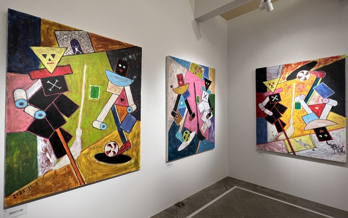 2022.12.01 93点目。幾何学模様で、中央には箒、巻物かトイレットペーパーのようなものも描かれている。左右で反転している。100点と自分で決めたが、飽きてしまって、寒山拾得の中に入れ込んでしまおうと。どのように寒山拾得から逃れようかと苦悩が始まったと。
