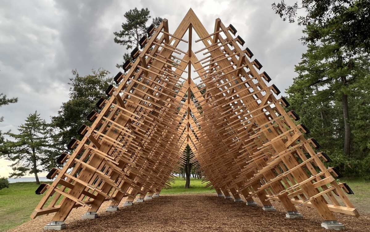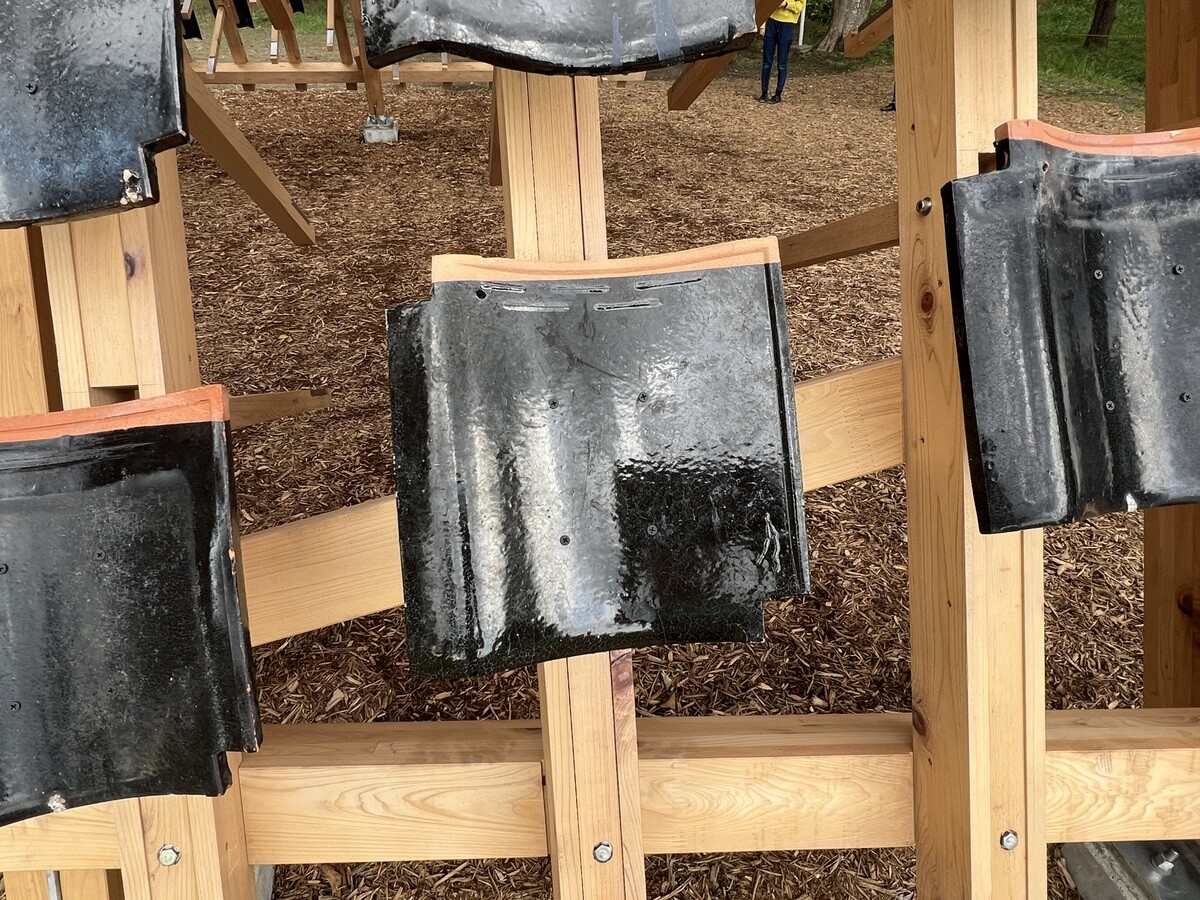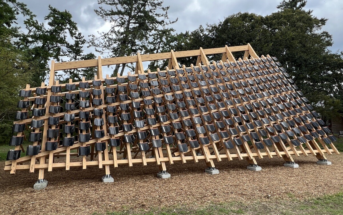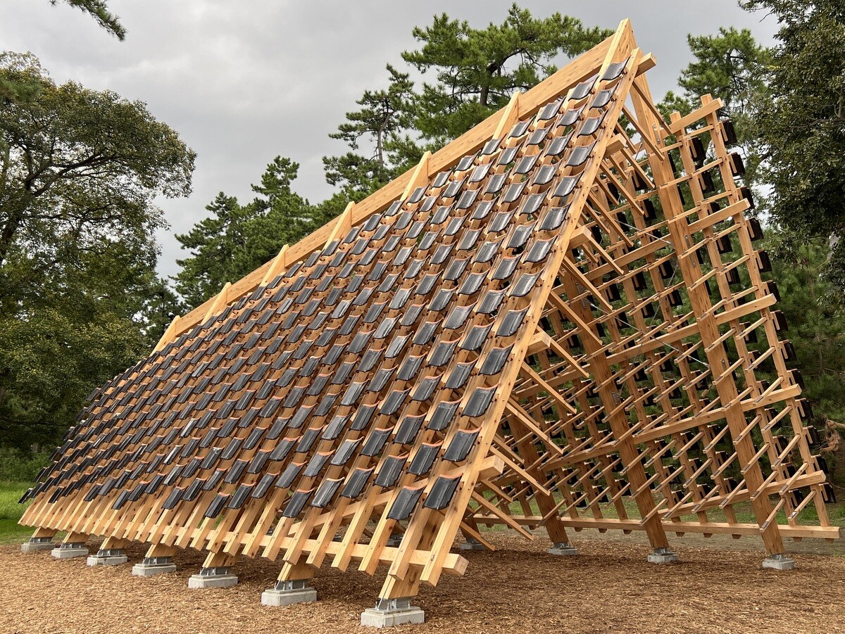 黒い瓦は熱を帯びて積もった雪を溶かしてくれることから。珠洲市は能登瓦の生産で有名だったが、今年発生した地震の被害が非常に多かった。芸術祭は地震により、3週間延期して開催が決定したが、震災を受けて、当初のデザインを切妻屋根に変更。素材は、住民達がゆずってくれた物を使い、復興を願った。作品名の「家のささやき」は、漢字で「家静」と書き、同じ発音で「ますますよくなる」という意味の言葉もあるのだそう。