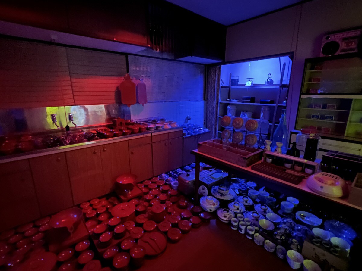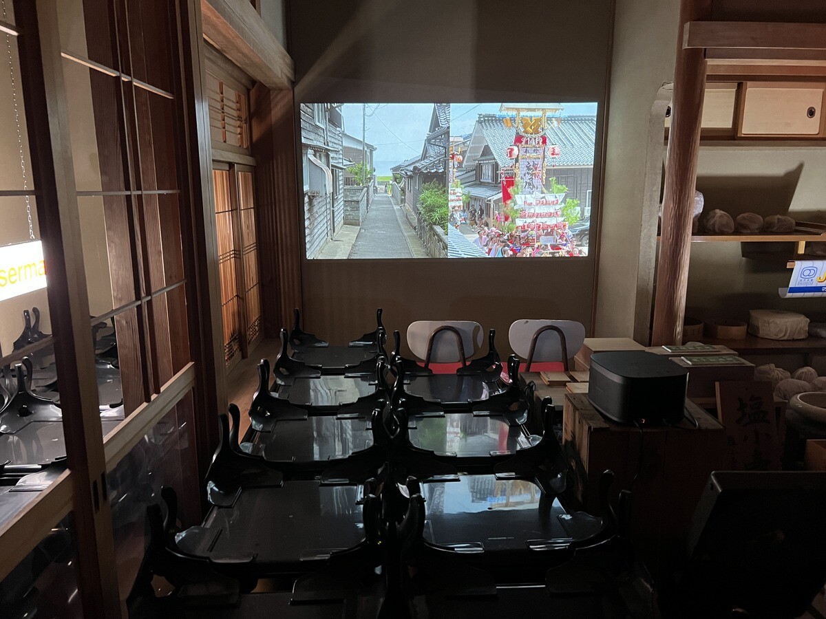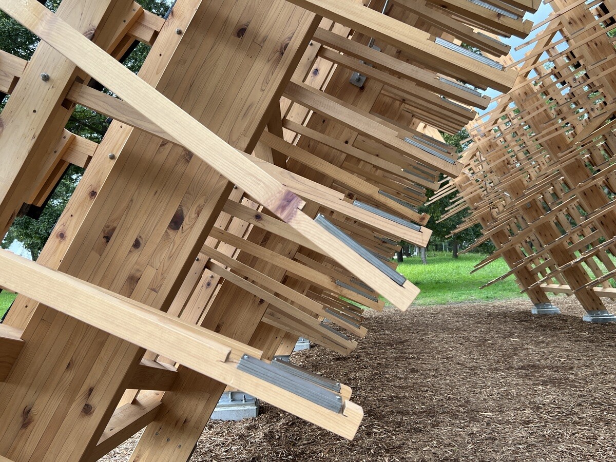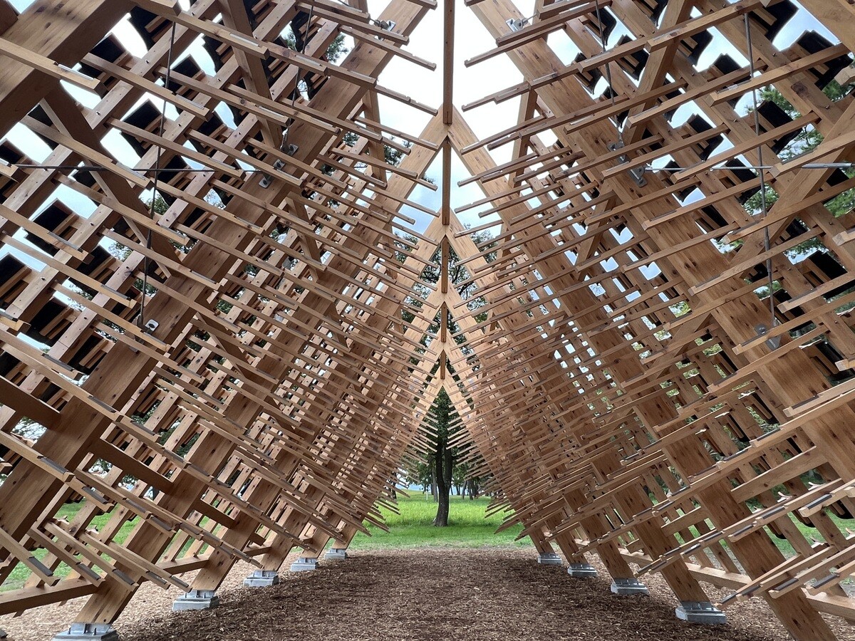 黒い瓦は熱を帯びて積もった雪を溶かしてくれることから。珠洲市は能登瓦の生産で有名だったが、今年発生した地震の被害が非常に多かった。芸術祭は地震により、3週間延期して開催が決定したが、震災を受けて、当初のデザインを切妻屋根に変更。素材は、住民達がゆずってくれた物を使い、復興を願った。作品名の「家のささやき」は、漢字で「家静」と書き、同じ発音で「ますますよくなる」という意味の言葉もあるのだそう。