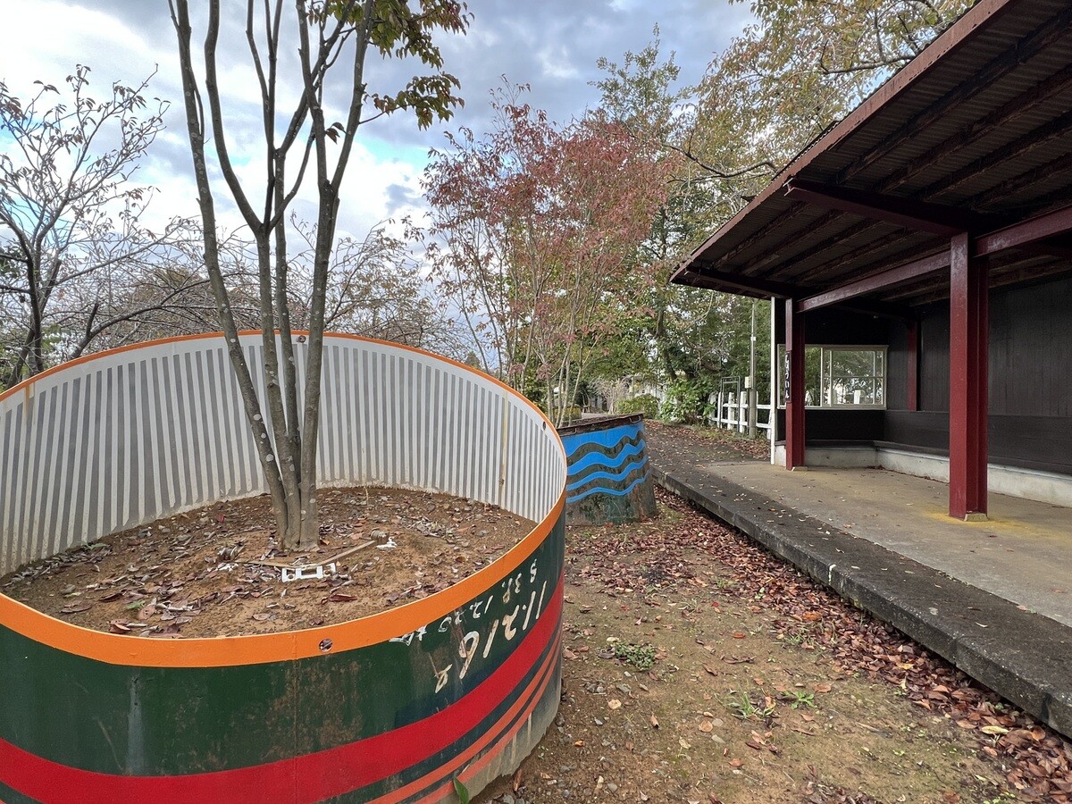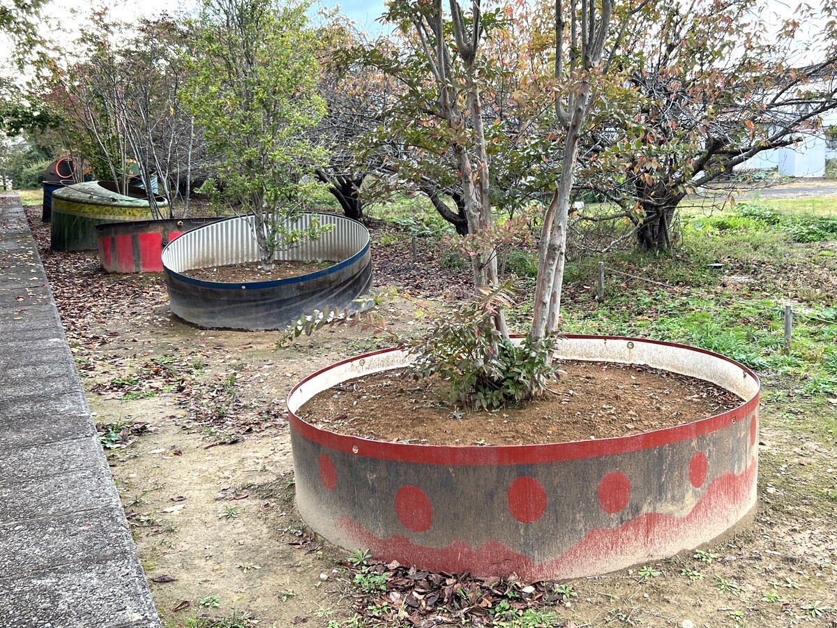 能登線の旧正院駅の線路脇に、焼酎貯蔵用のタンクを使った巨大な植木鉢が埋められている。