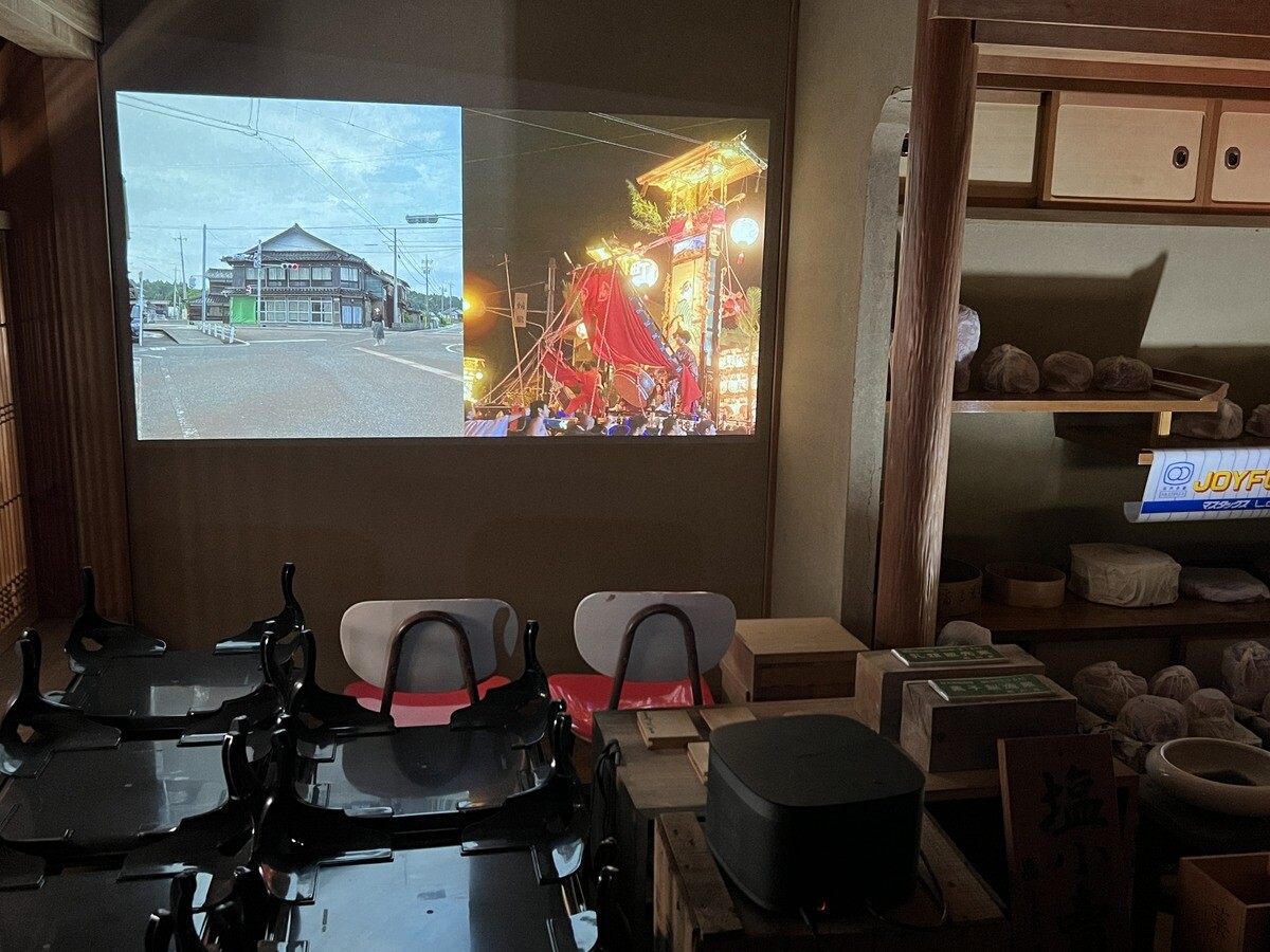 OBI(おび)は、鈴木泰人氏(美術)、本間智美(建築)、水野祐介(映像)によるアーティストコレクティブ。4つのスクリーンでは、お祭りをしている時としていない時の町の対比や、日常の様子が流れている。