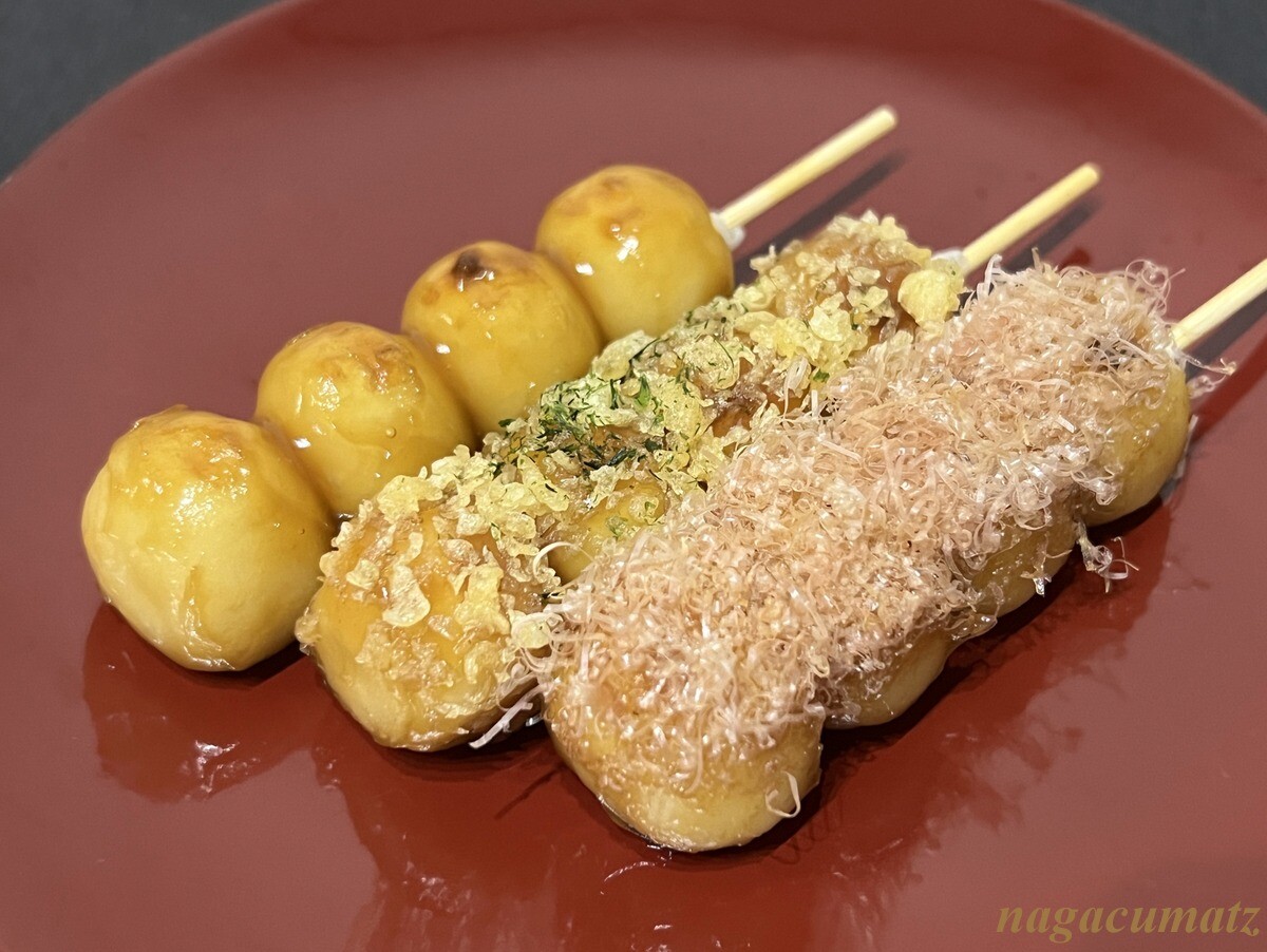 天ぷらにしろ、鰹節にしろ、お団子と思わずに食べたらそれはそれで悪くないが、やはり定番が一番かも。柔らかい方が好きな我々としては、みたらし団子はじめ、お団子全体が結構しっかり硬め。