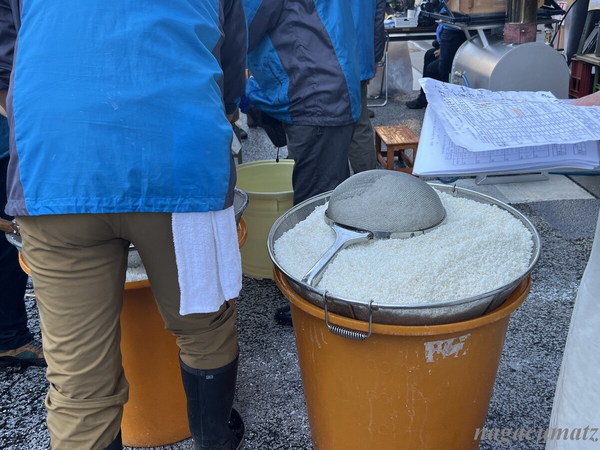 本部では、糯米を巨大な蒸し器で蒸しておられ、蒸し上がるとマイクで町会が順次呼ばれて、各町会がそれぞれお餅つきをされると言うしくみのよう。