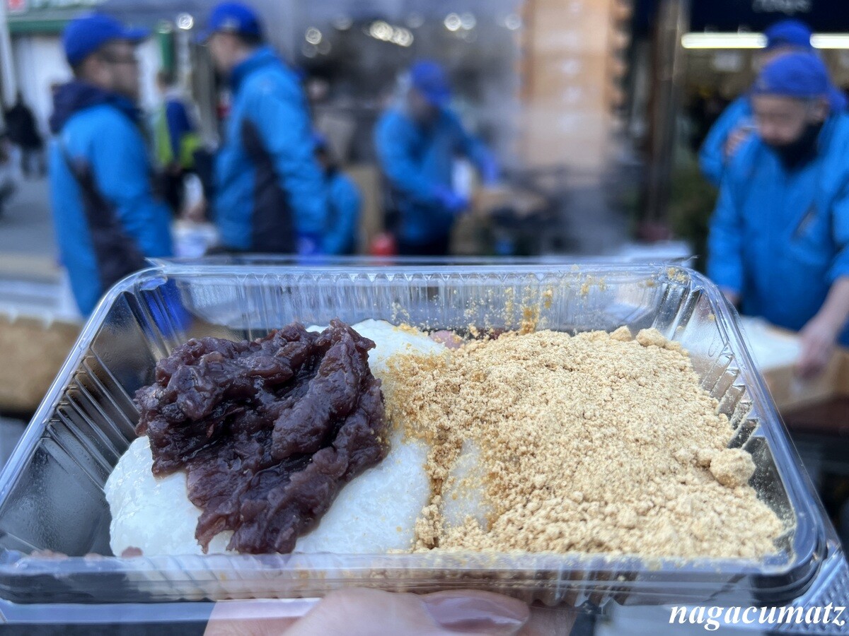 あらかじめお餅券がないと、つきたてのお餅はいただけないのかと思ったのだが、一般にも販売されていた。餡と黄粉の2種類が1パックになって250円。