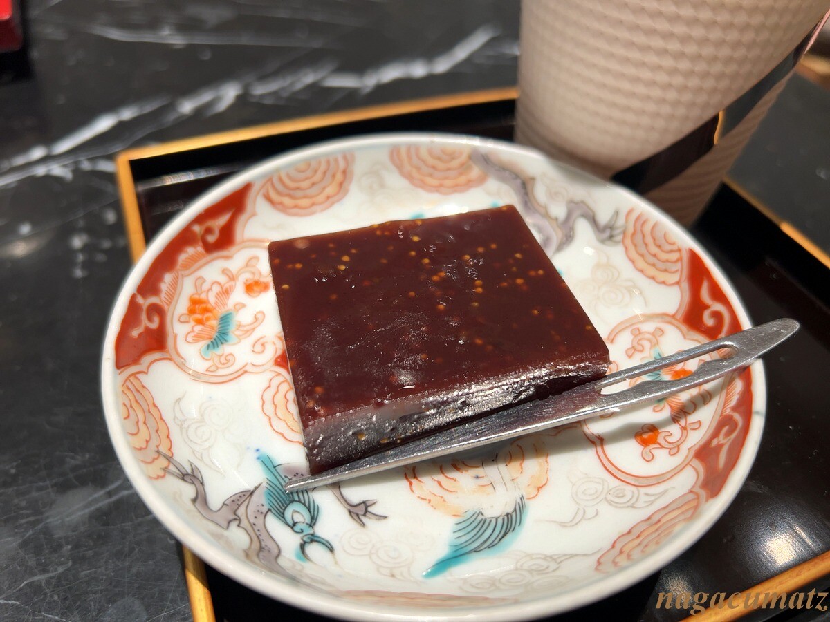 赤ワインと無花果の羊羹とお茶(ほうじ茶を選択)セット 990円 美味しい羊羹だった。