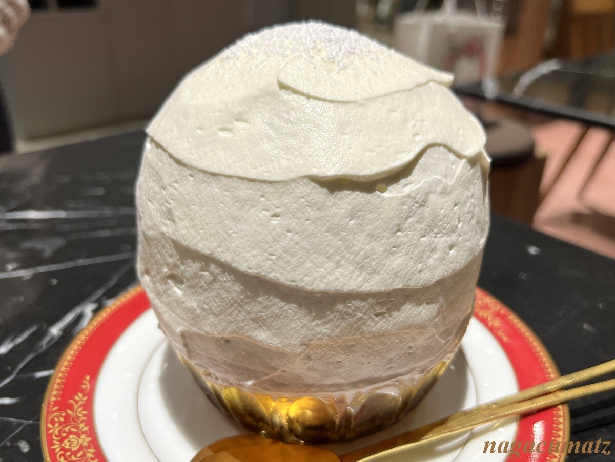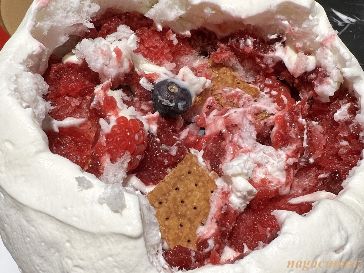 ベリーベリーホワイト 2100円 店内のみでしか食べられないとのこと。生クリームで覆われた中にはかき氷。しかもその中には、ラズベリー、苺、ブルーベリーなどがクッキーと共に入っていて、非常に美味。注文して良かった!