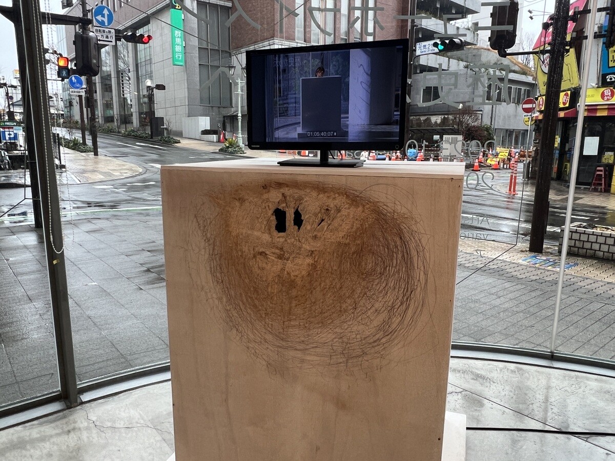 村田峰紀「Neck Live」首だけを大きな木箱から出して、内部で内側の壁をボールペンでひっかくように描いて作られた。2015年の安全保障関連法成立に反対して12万人が国会前に集まって抗議デモを行ったにもかかわらず安保法が成立。「手も足も出せない」状況を身体を使って展示して見せたもの。ビデオでは制作の様子が流れている。