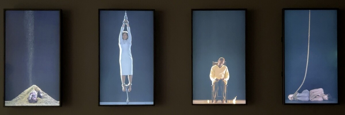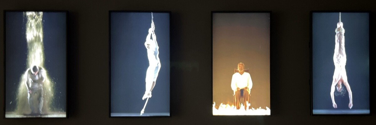 なかなかパワフルな動画作品4点。異なった刑罰を与えられている様子。水が注ぎ落ちる、椅子の周りに火が燃え上がる、吊された状態で激しい風にさらされて揺れ動く、泥に埋まり周りから泥が舞い上がっていく、、、など。