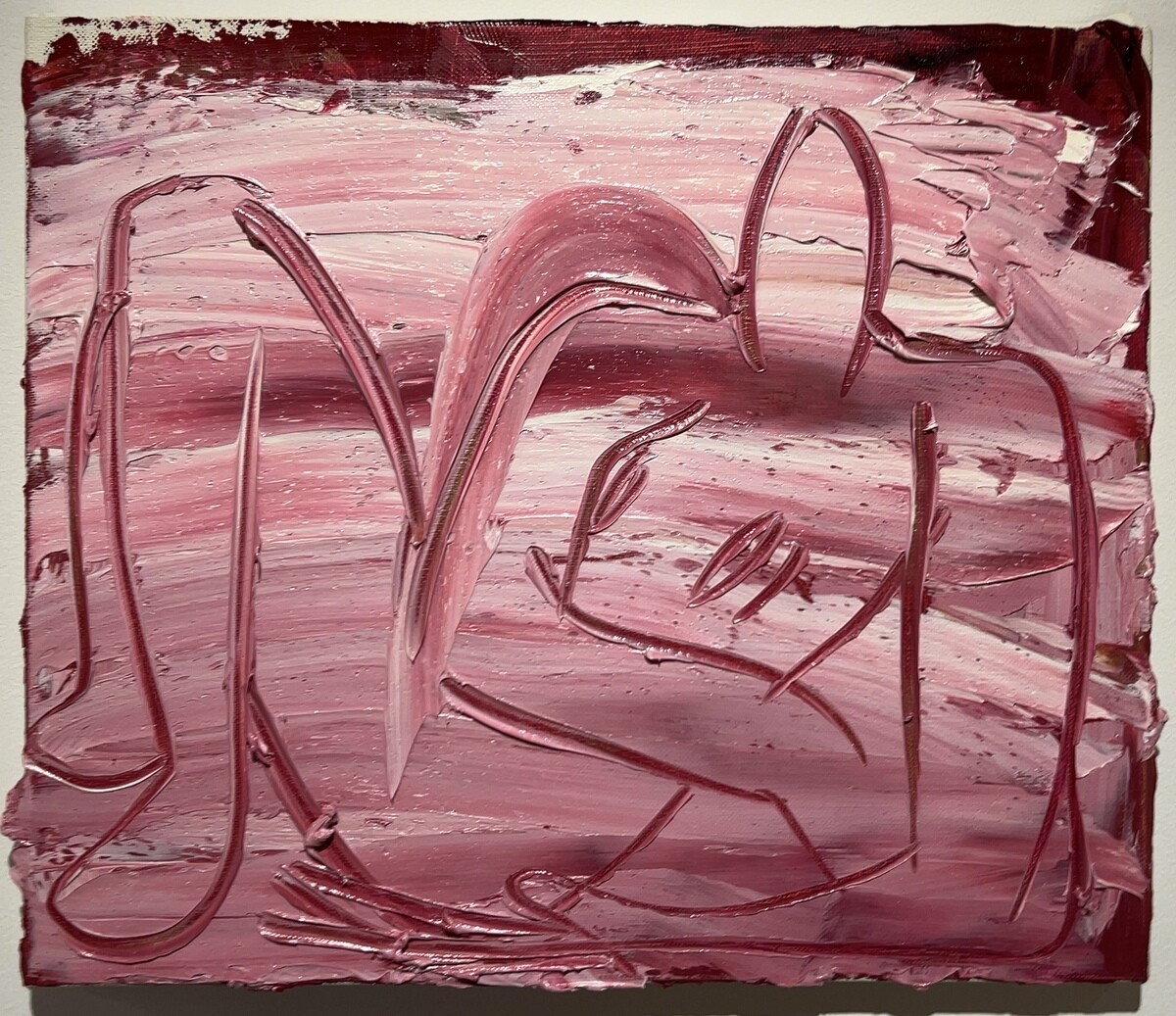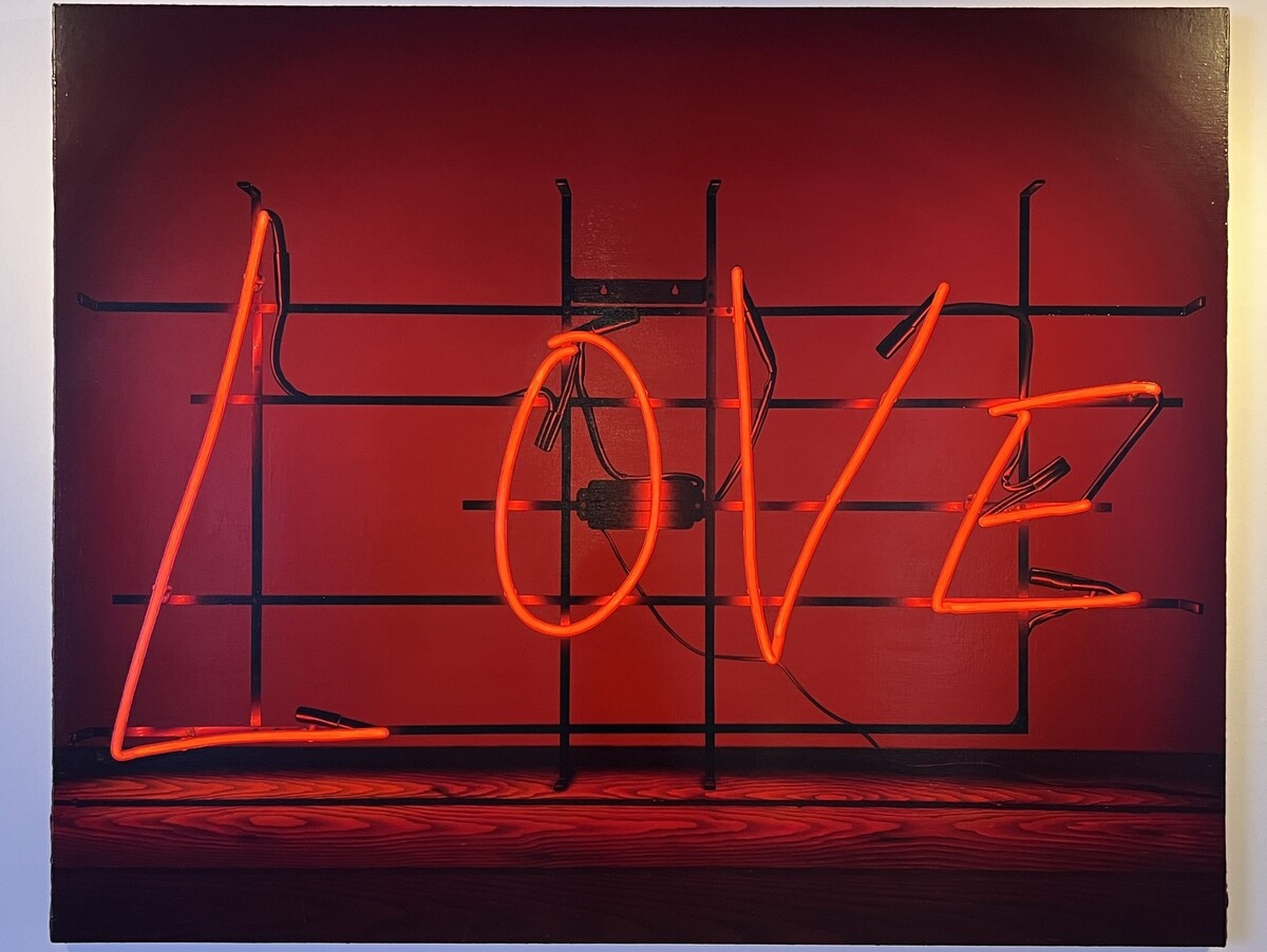 横山奈美「Shape of Your Words -I. O.-」2023 横山氏の親しい人物が手描きした「History」「自由」などの文字を元にしたシリーズ。手描きされた「LOVE」を、ガラス管で忠実に制作してもらい、それをキャンバスに油絵具で描き写している。