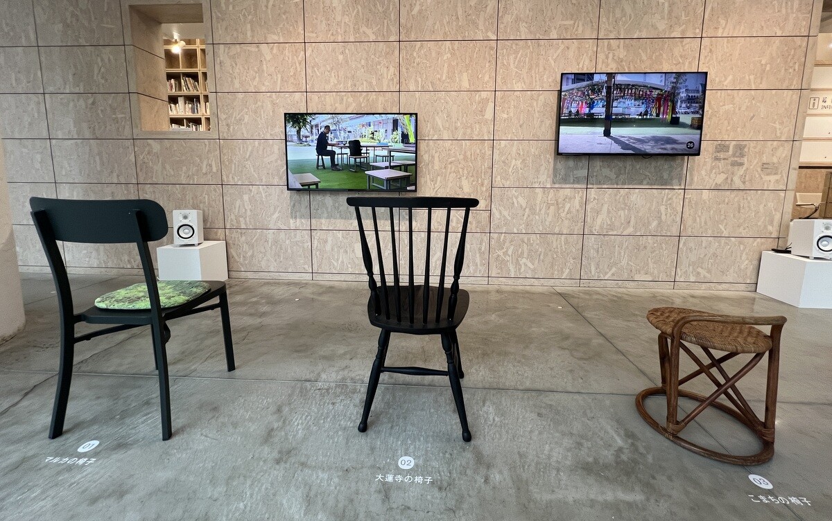 市内の人々から借り受けた椅子が並べられ、それらが運ばれて来た様子などの動画も流れている。