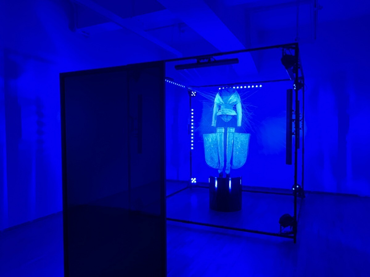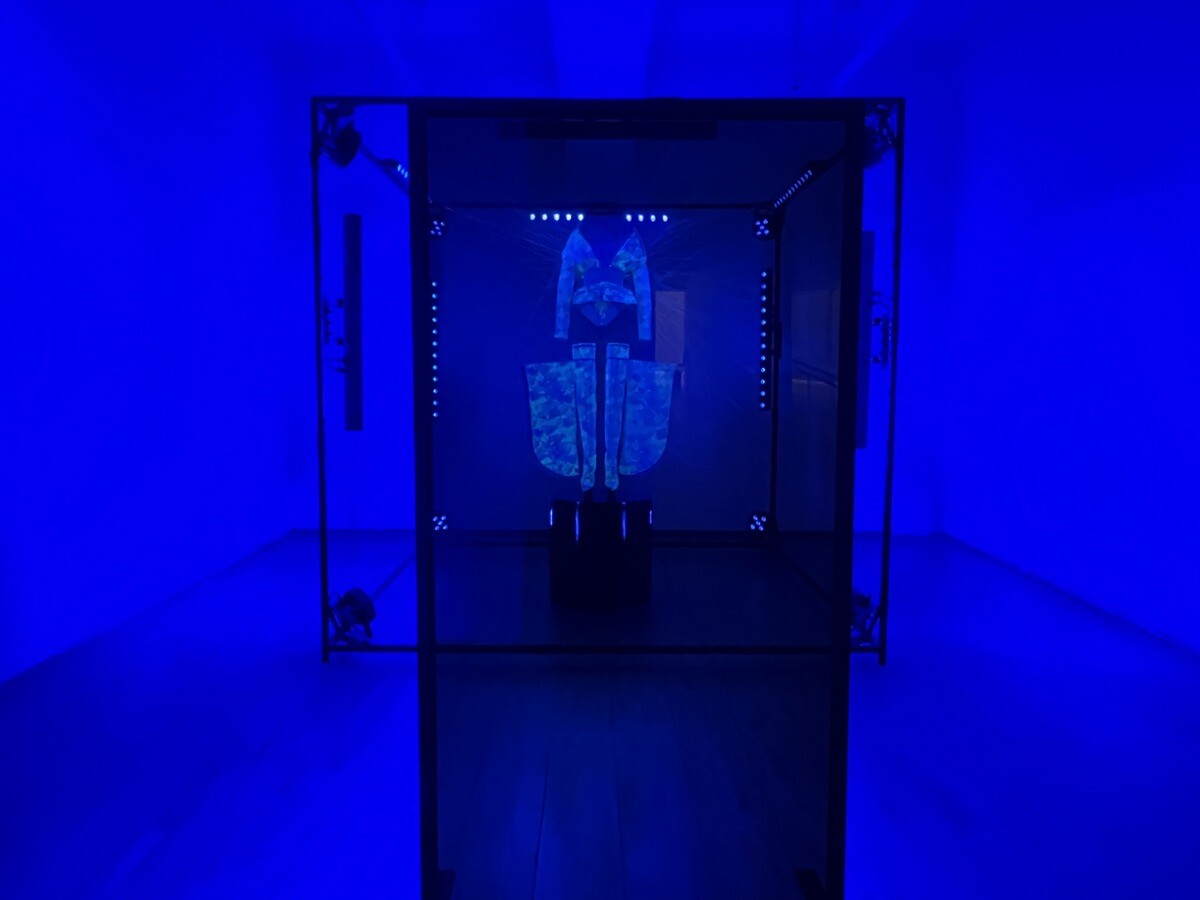 ホタルイカの遺伝子を挿入して品種改良し、養蚕技術がある前橋で育てられたカイコの生糸を使っている。手前にボードがあり、それを通して見る時と、なしで見る時で異なる。
