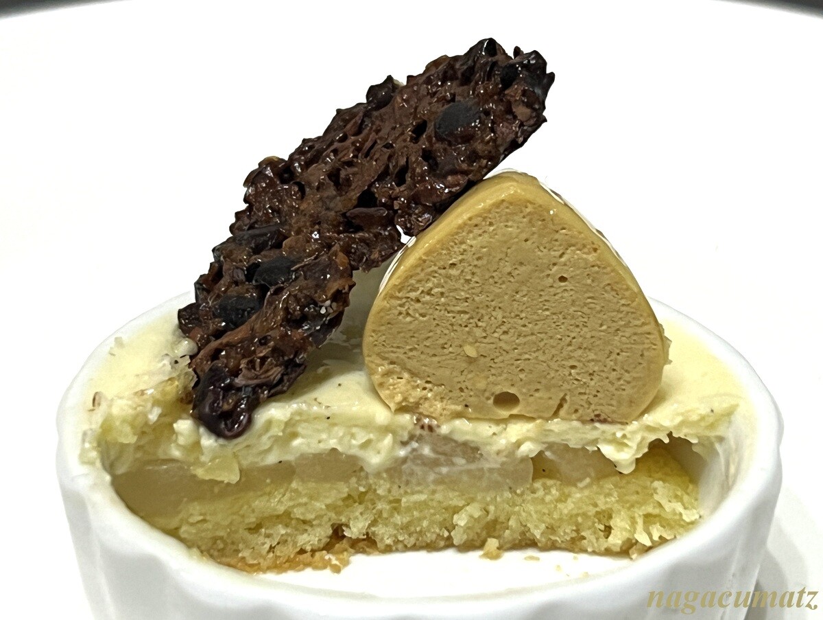 洋梨のコンポートが入ったキャラメルムースに、バニラと洋梨のクリームと、カカオのチュイールが載る。洋梨のクリームが美味しい。チュイールは苦いぐらいのビター風味。