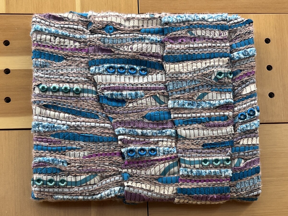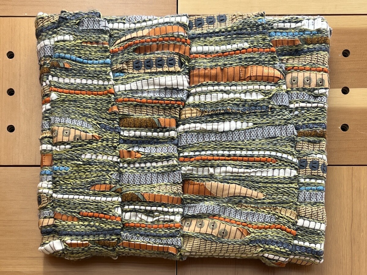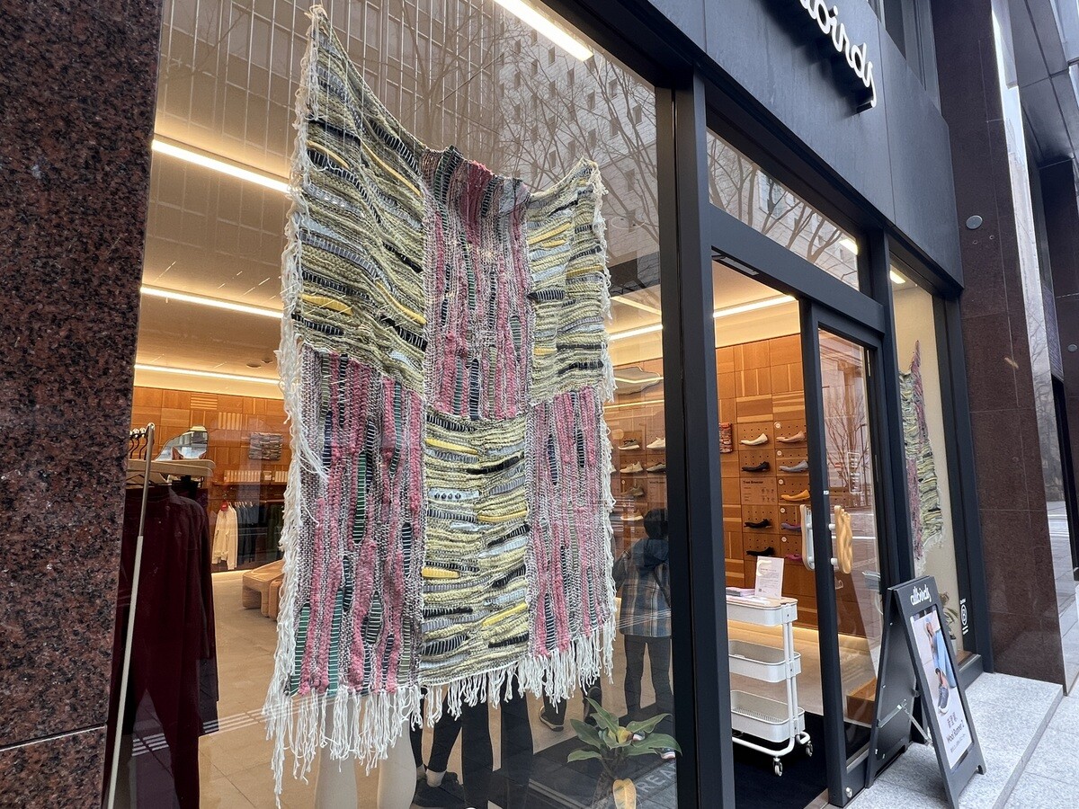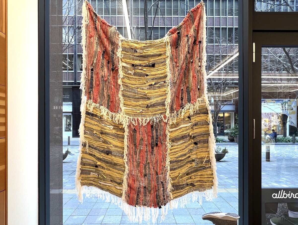 作品は裂き織りと呼ばれる技術で作られ、古布や古着などの既製品を、織機を使って新たな布へ再構築しておられる。Allbirds製品の端切れの提供を受け、シューズのディテールを織物作品のアクセントに。