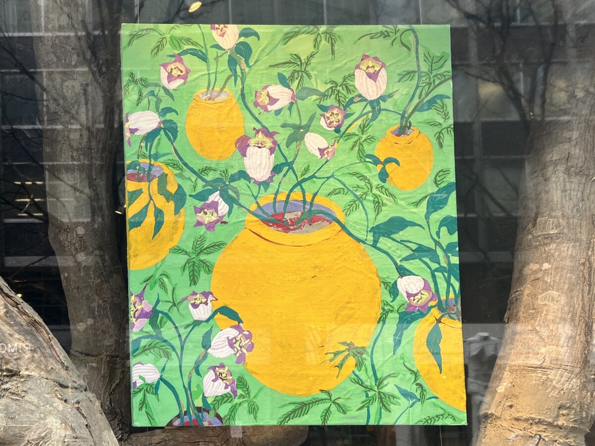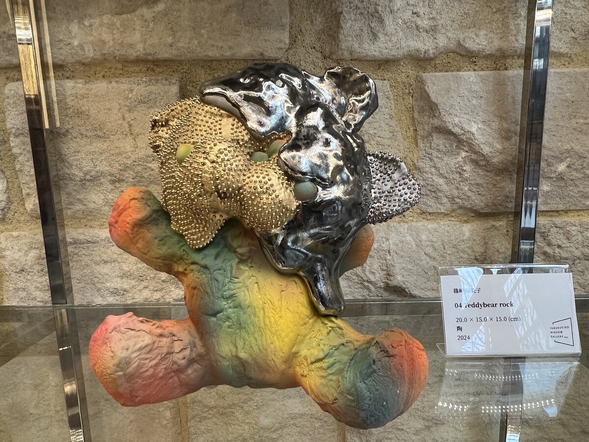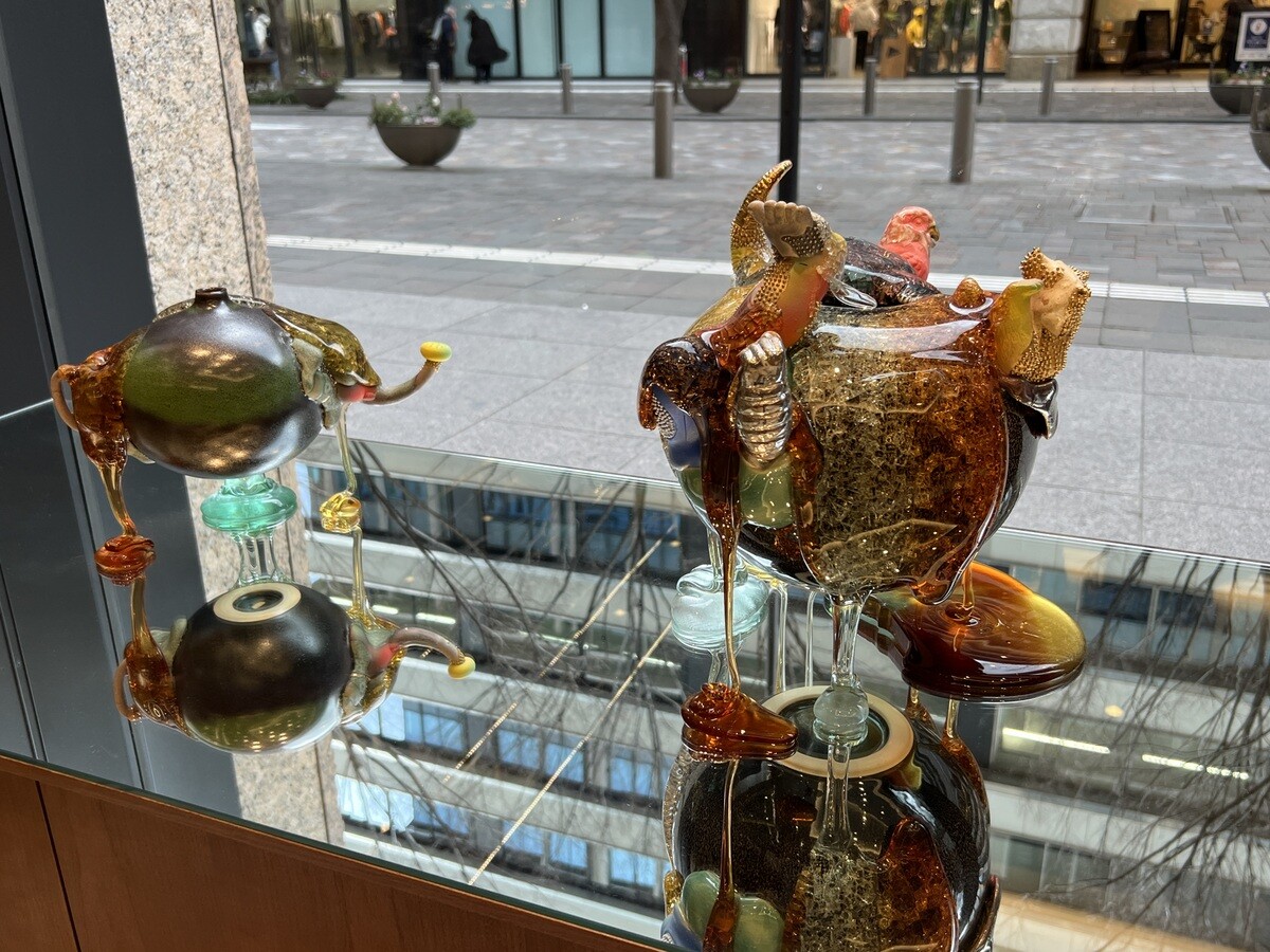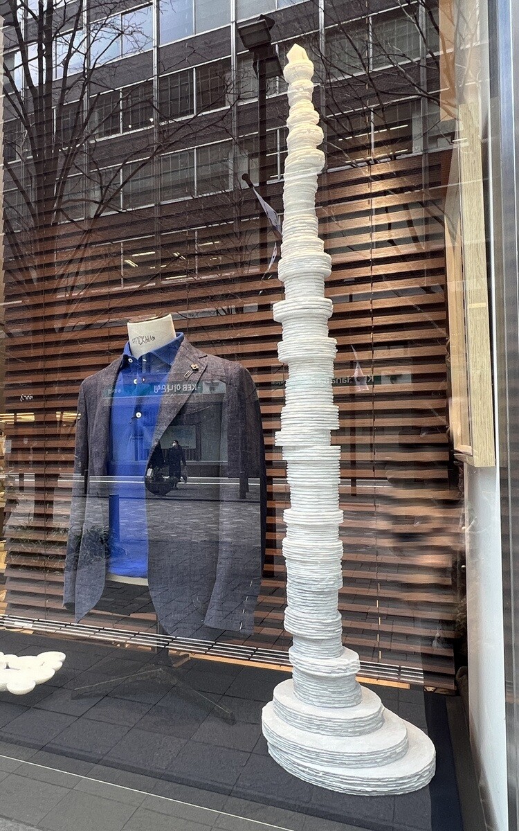 今年で3回目を迎える「有楽町ウィンドウギャラリー」。アーティスト8人の作品が、丸の内仲通り沿いの参加店舗8軒に展開されている。1店舗のみ、そこでの飲食をしないと見られないと言うことなので、7店舗の作品を。