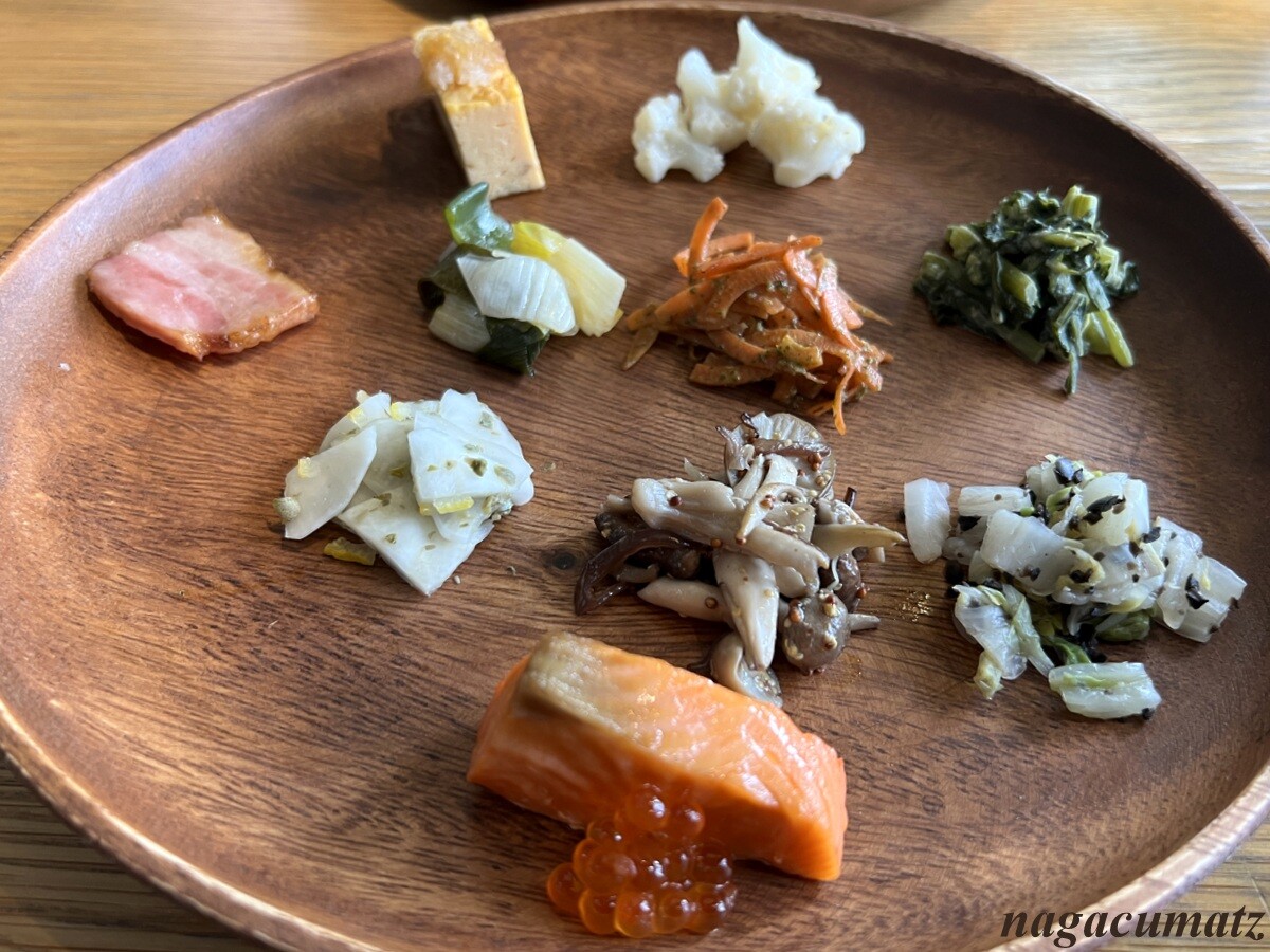 群馬の朝ご飯は、卵焼き、Hutte Hayashi のベーコン、銀鮭の塩焼き 鱒子の醤油漬け、カリフラワーのシーザー風、春菊の胡麻和え、白菜のマリネ、4種の茸のソテー、下仁田葱のピリ辛和え、蕪のサラダゆず風味、人参のバジル風味。