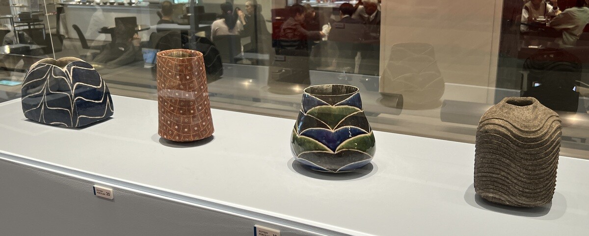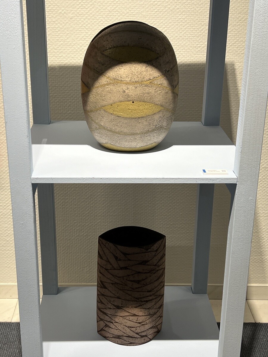 左から「一九八十壺」1980年、「彩陶筒」1971年頃(これは前回展示されていた)、「壺」1975年、「曲線彫文壷」1970年