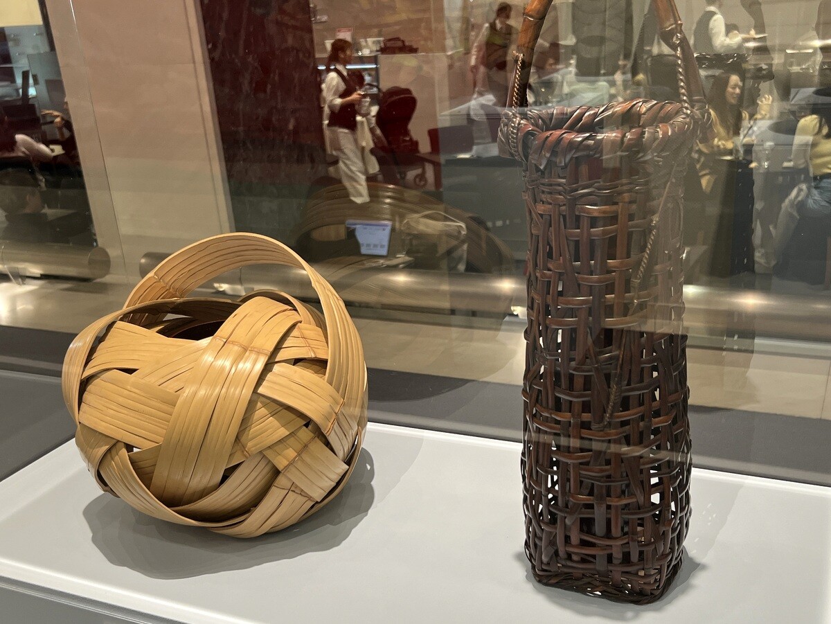 左から:飯塚琅玕斎「花籠『久寿玉』」、初代田辺竹雲斎「天然竹手『長生』花籠」