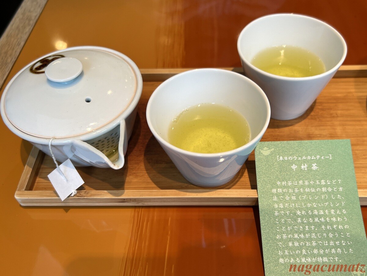 この日のウェルカムティーは中村茶。煎茶、玉露など7種類をブレンドしたもので、とても甘く美味しかった。以前に夏に来た時には、5種類をブレンドしたものをまず水出しで飲んでからお湯を注いでいたので、季節によっても変えておられるもよう。