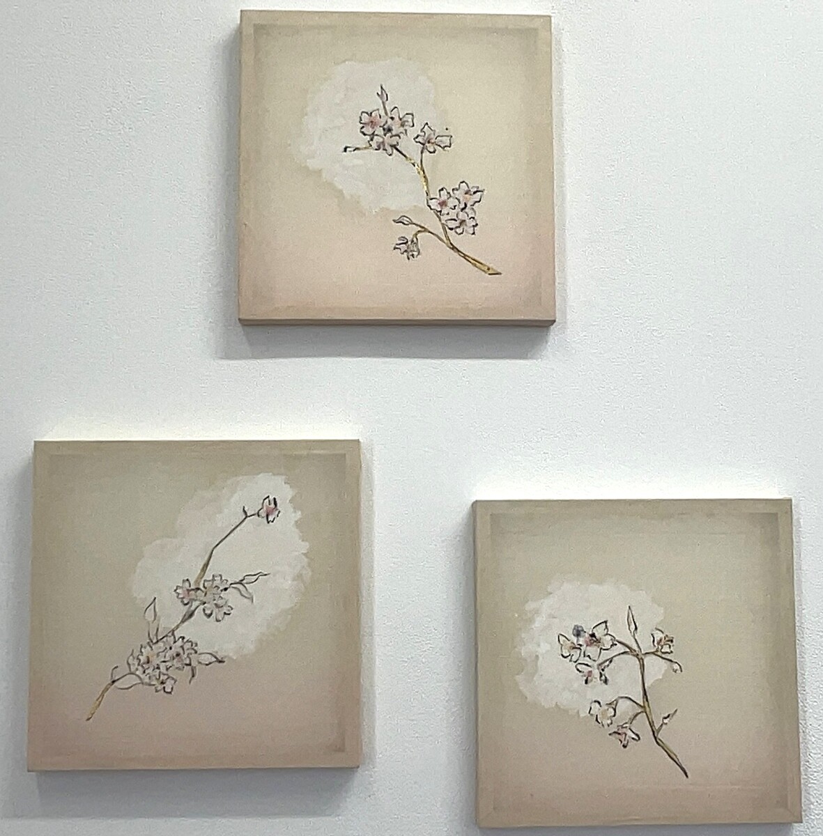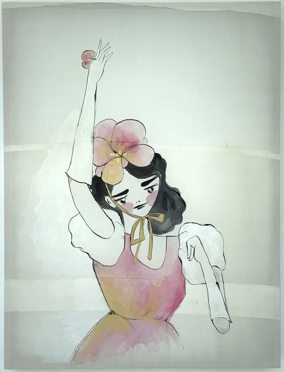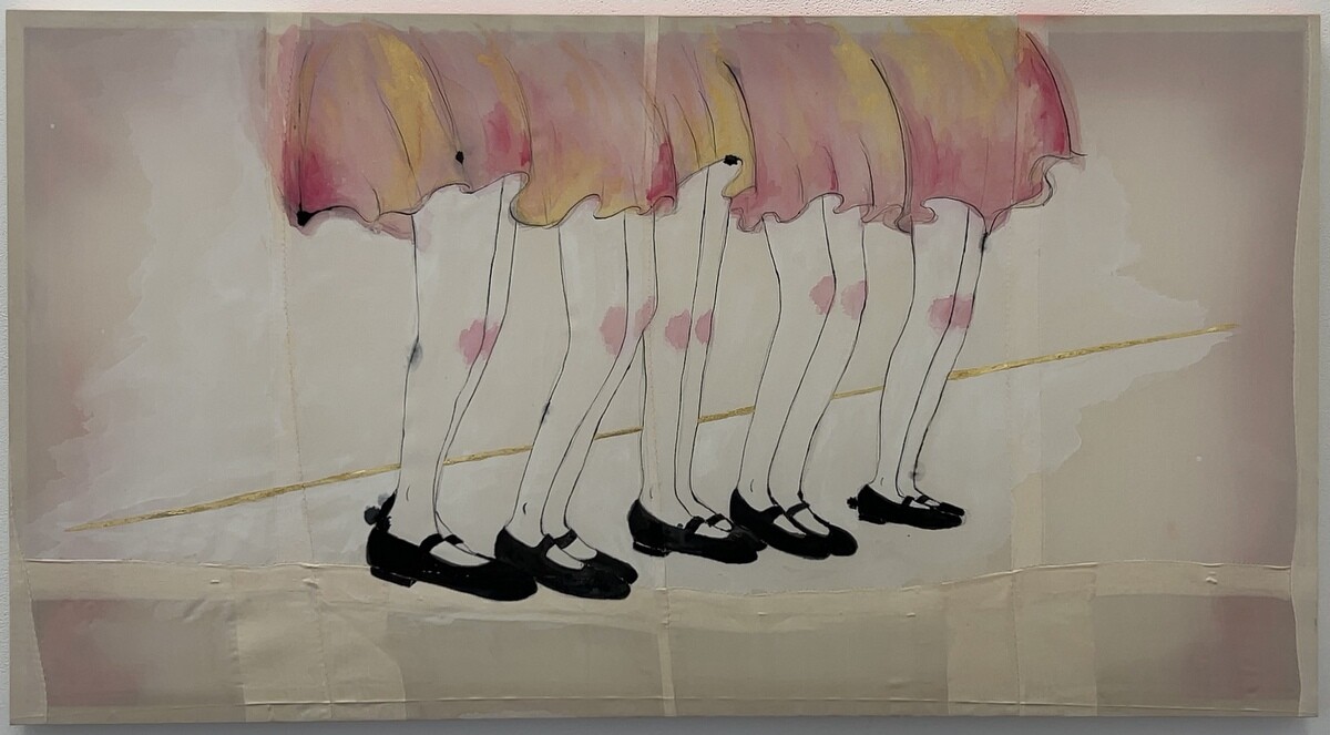 東京宝塚劇場が風船爆弾製造のために使用された歴史をふまえ、宝塚歌劇団が戦後初めての公演で披露した「春のをどり」をテーマとしたペインティングは、学徒動員を経て生還した団員が踊るシーンが描かれており、ペインティングの支持体に小林氏の祖母から譲り受けた着物と襦袢や裏地を用いているとのこと。