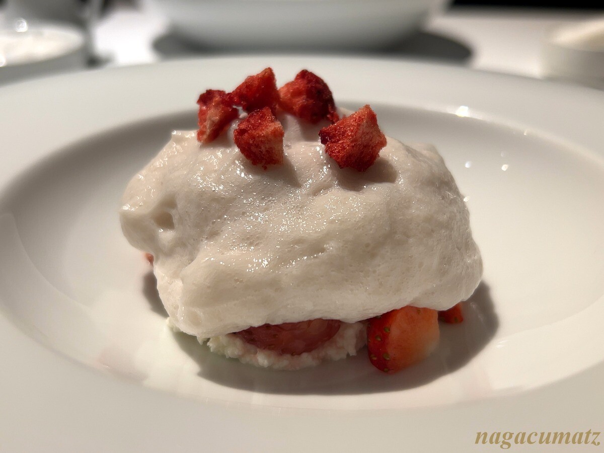 ひたち姫とクレームダンジュ(クリームチーズ)の中にソルベが入り、上から白ワインのジュレとドライストロベリーがかかる。白ワインのジュレが美味。
