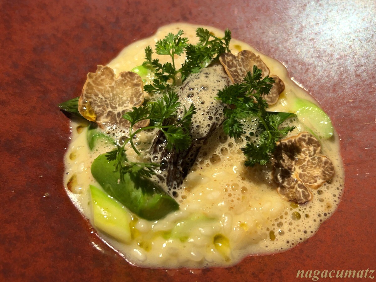 アスパラガスとモリーユ茸のリゾットには、モリーユ茸の泡、春のトリュフが載る。アスパラのしゃきしゃき感が良い。
