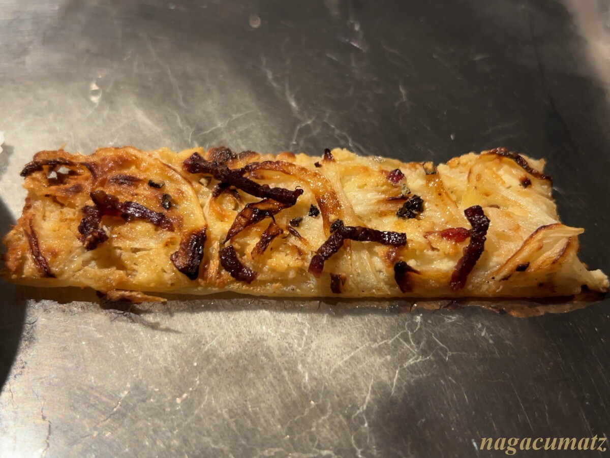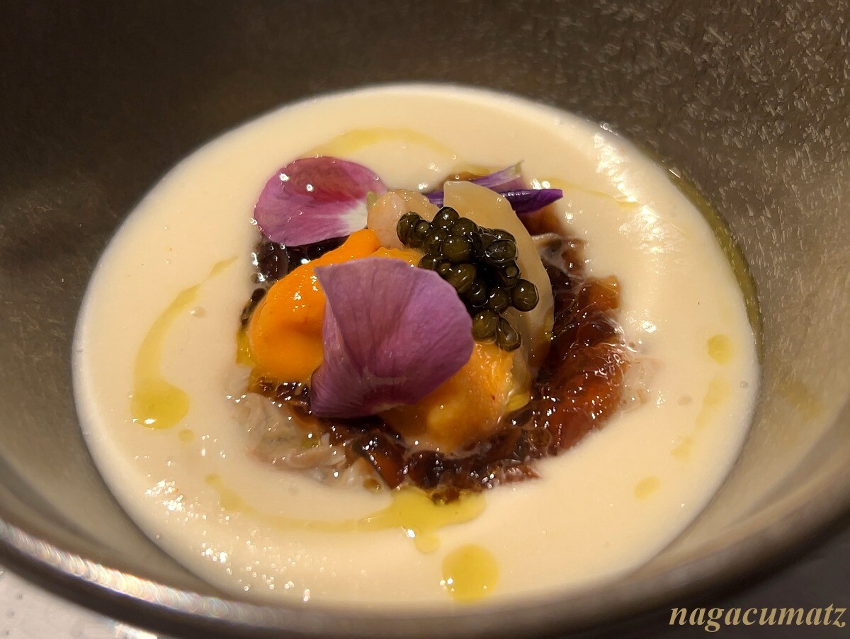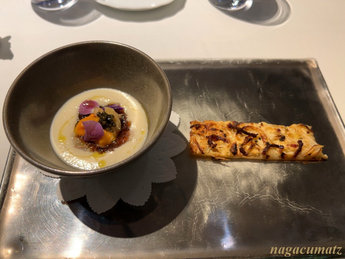 新玉葱のポタージュには、コンソメジュレ、アサリ、雲丹、キャビアなどが載る。横には新玉葱を使ったアルザスのタルトフランベ。