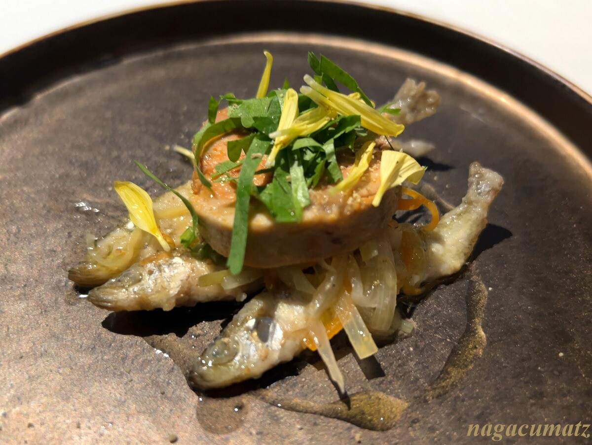 ワカサギのエスカベッシュには、あん肝とパクチーが載る。