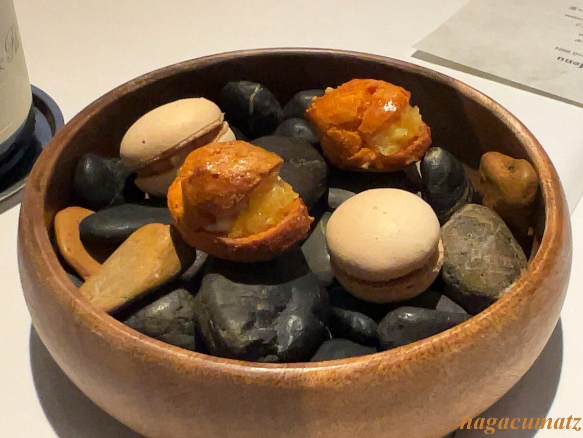 突き出しは、四万十の麦味噌のマカロン、水牛のミルクを使ったクリームとオレンジのグジェール