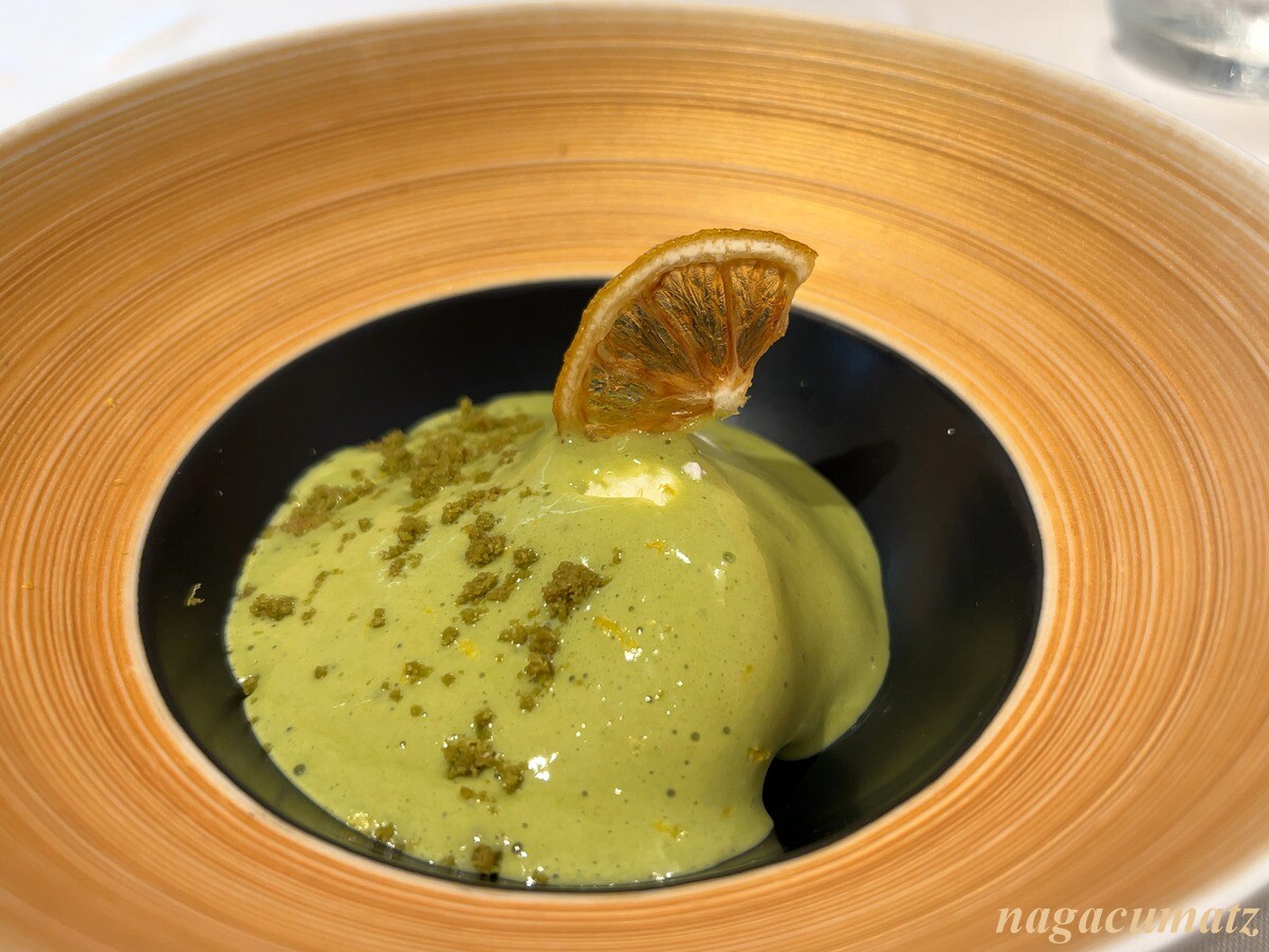 こごみ、わらび、空豆が入ったジャガイモのエスプーマには、コンソメとうるいが載る。