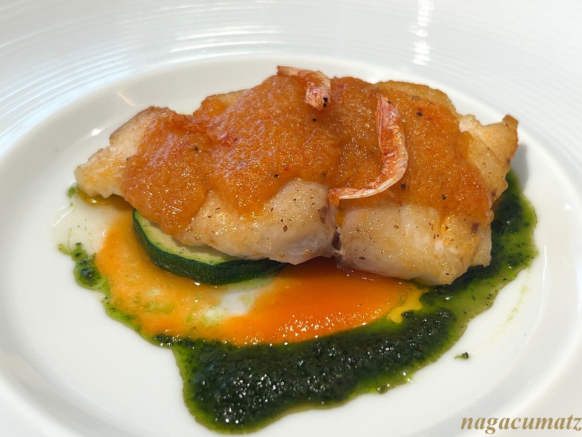 真鯛には、桜海老が載り、2種類のソース。